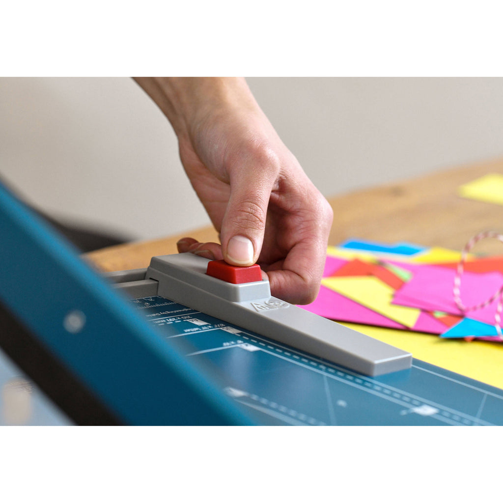 This paper cutter has a wide, strong paper guide backstop for accuracy when making repetitive cuts. The measurement grid includes common trimming sizes for fast and easy alignment, and the ergonomic cutting handle is contoured to be more comfortable while trimming.