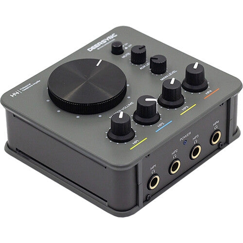 Designed to redefine your audio experience, the DEERSYNC H4 is a desktop headphone amplifier that splits a single audio source into four discrete channels. Simply route audio into the device through two 1/4" main inputs, adjust the master volume and fine-tune each headphone with the dedicated headphone level control for each channel.