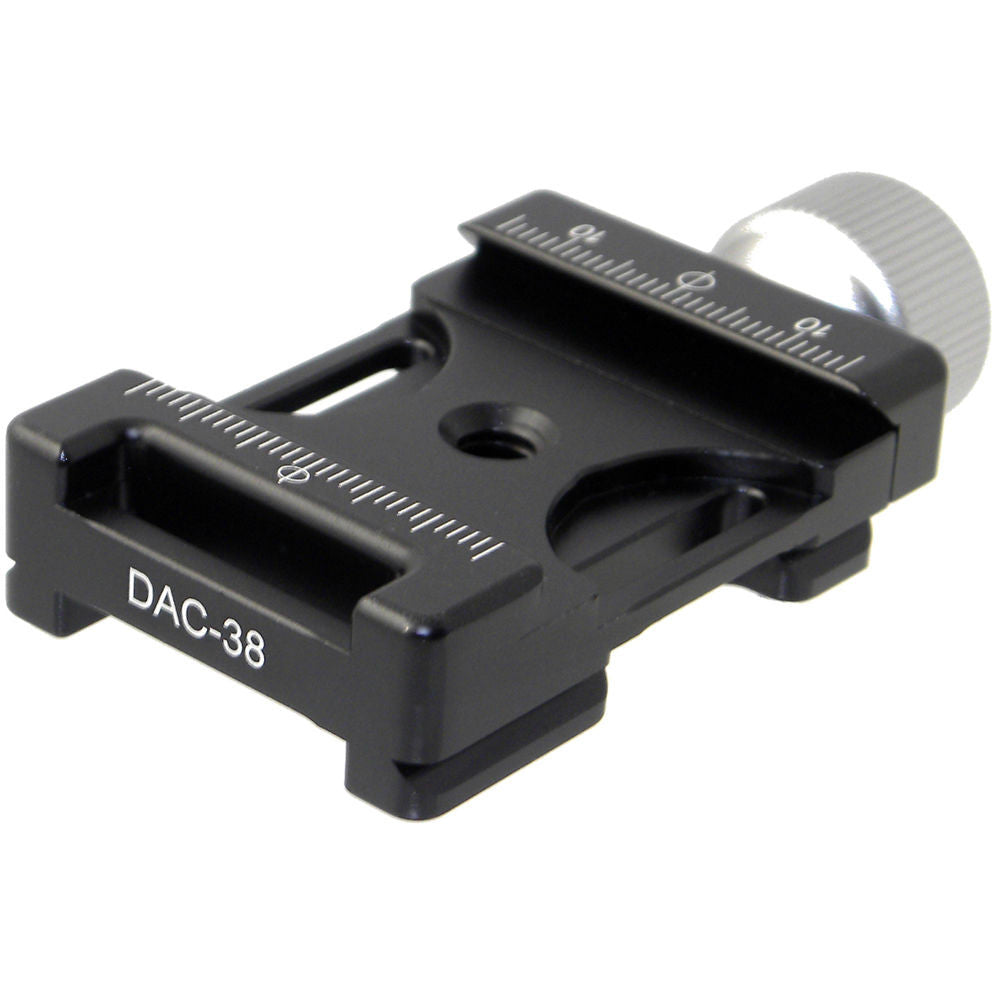 The DAC-38 Quick-Release Clamp is a simple Arca-type compatible clamp with a numbered scale on the top. The clamp can be attached to another clamp via the bottom dovetails or the 1/4"-20 female thread. Three Strap Boss slots on the clamp can accommodate a camera strap.
