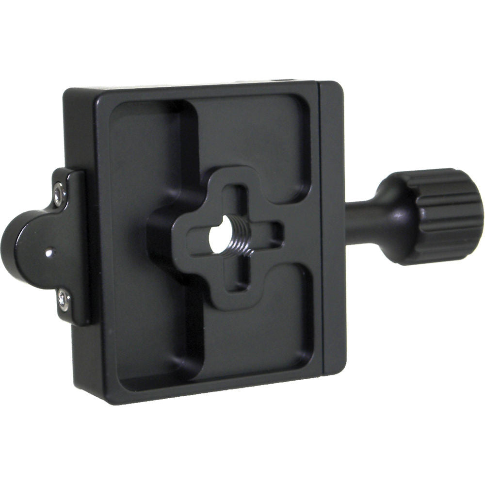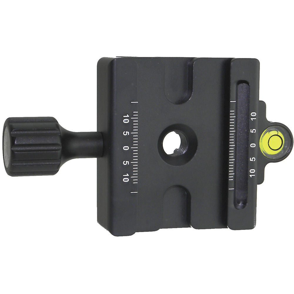 A numbered scale on the clamp allows for precision positioning of Arca-type plates. Two safety stop grooves allow the use of plates with safety screws, to prevent the plates from accidentally sliding out of the clamp. It has a 3/8"-16 threaded hole to mount the clamp onto a tripod or ball head, and also comes with a 1/4"-20 bushing adapter.
