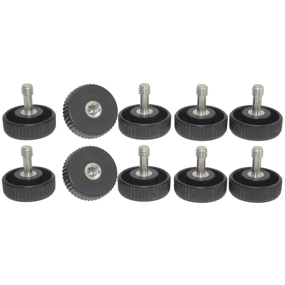 This pack of Long Shaft 1/4"-20 Male and Female Screws from Desmond consists of ten long-shaft screws. The screws have a 1/4"-20 male screw on top, and a 1/4"-20 female threaded receiver on the bottom. A plastic base allows the screws to be hand-tightened.