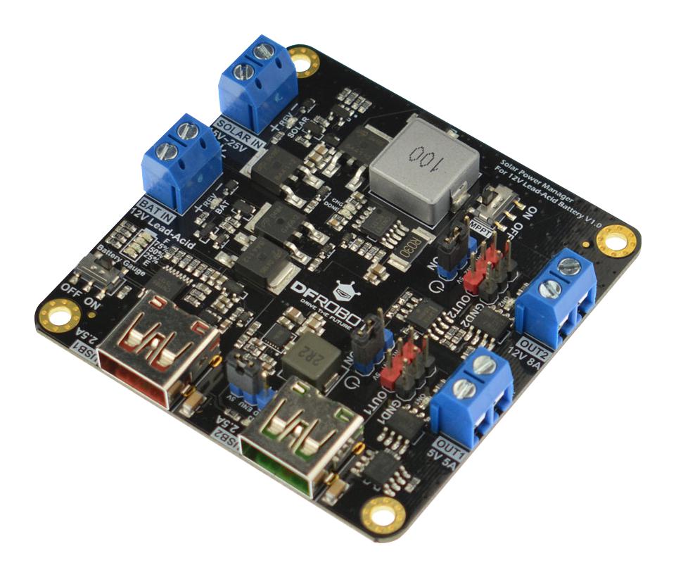 DFR0580 is a solar power manager for 12V lead-acid battery. It is designed for IoT projects and renewable energy projects, providing safe and high-efficiency embedded solar power management modules for makers and application engineers. This medium-power high-efficiency solar power management module allows you to charge a 12V lead-acid battery with a maximum of 4A using a standard 18V solar panel.