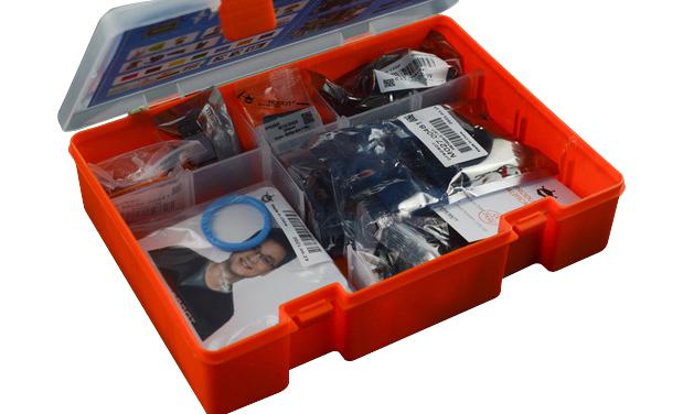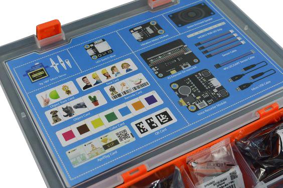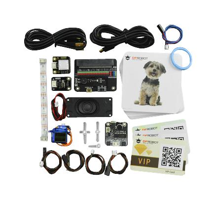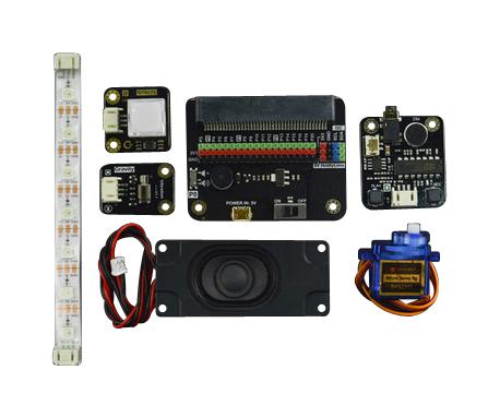 IO extender for micro:bit x 1, Gravity: vibration motor module for Arduino x 1, Gravity: voice recorder module x 1, Stereo enclosed speaker-3W 8ohm x 1, 9g 180° micro servo x 1, Bistable LED switch - blue x 1, RGB full colour LED strip x 1, Micro USB cable x 2, Gravity: digital sensor cable x 4, Gravity: 4pin I2C/UART sensor cable x 1, Face card x 5, Colour card x 7, Object card x 4, Barcode card x 3, QR code card x 3, Object tracking card x 3, Label card x 3, Plastic round snap ring x 1.