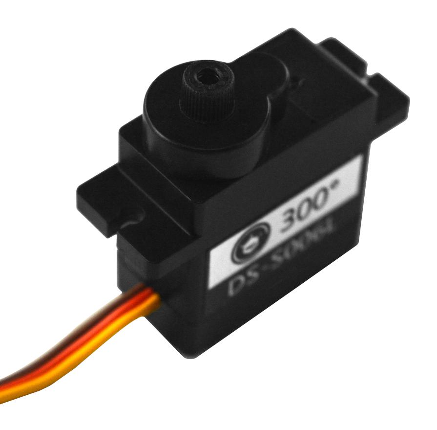9g 300° clutch servo. When the angle of a servo is changed by external forces during normal operation, the servo can automatically reset and continue working through clutch function, which prevents it from being damaged. After being blocked for 5 seconds, the servo will automatically turn off its power to avoid getting burned. This servo features large torque, stable performance, accurate running angle and easy to install. There are no limited switches inside the servo so it can rotate smoothly in 360 degrees (manually only). Meanwhile, the servo could operate fluently with minimal power and you can just supply power to it by normal battery or USB. In addition, users can directly control the servo using servo libraries in Arduino IDE and let it reach a maximum 300 degrees rotation angle within the pulse range of 500-2500µsec.