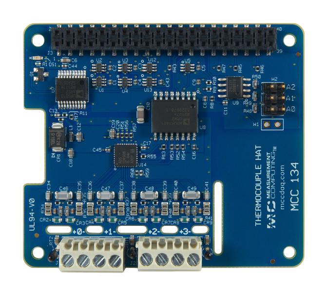 The Measurement Computing MCC 134 is a thermocouple measurement HAT (Hardware Attached on Top) designed for use with Raspberry Pi®. It features 24-bit resolution and provides professional-grade accuracy which is best in class. The MCC 134 provides four isolated thermocouple inputs. Users can connect up to four differential thermocouples (TC) to the MCC 134 input channels. TC types are software-selectable per channel. TC values can be updated every 1second minimum. The MCC 134 is equipped with open thermocouple detection for all TC input channels so users can monitor the board for broken or disconnected thermocouples. HAT configuration parameters are stored in an on-board EEPROM that allows the Raspberry Pi to automatically set up the GPIO pins when the HAT is connected. Open-source MCC DAQ HAT Library of commands in C/C++ and Python allows users to develop applications on Raspberry Pi using Linux. Console-based and user interface (UI) example programs are available for each API.