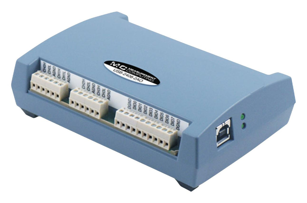 USB-2408-2AO is a high precision thermocouple and voltage measurement USB DAQ device. The USB-2408-2AO data acquisition device has 24-bit resolution for highly accurate measurements. Features include thermocouple or voltage configuration per channel along with digital and counter functions. Up to two analogue outputs are available. The USB-2408-2AO is powered by the +5 volt USB supply from your computer; no external power is required. A USB cable is shipped with the device.