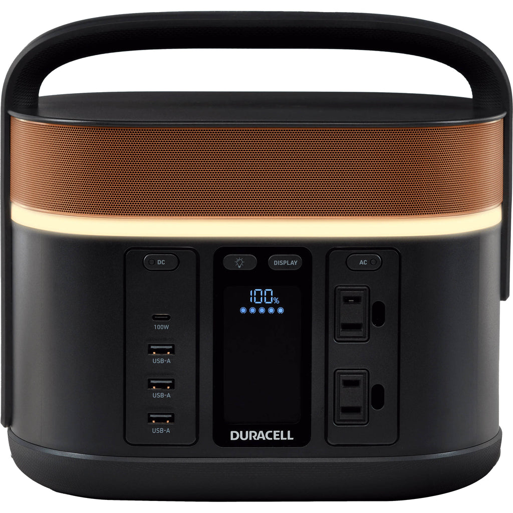 Charge or power electronics and small appliances anywhere with the G350 Portable Power Station from Duracell. Built in colors that look like Duracell's famous Coppertop battery, the G350 stores 274 watt-hours of power for everything from camping trips to power outages and makes it available through two AC outlets, three USB-A ports and one 100-watt USB-C port. The power station recharges in 4.5 hours from an AC outlet or 4.2 hours from a 12V car CLA (cigarette lighter adapter). An LCD display shows available power, charging status, warnings for short-circuits or overloads, and details of incoming and outgoing power. A decorative ring light provides a gentle glow, the power buttons light up when on, the AC adapter cable stashes neatly in a rear compartment, and the soft-grip handle makes toting the 9 lb unit easy.