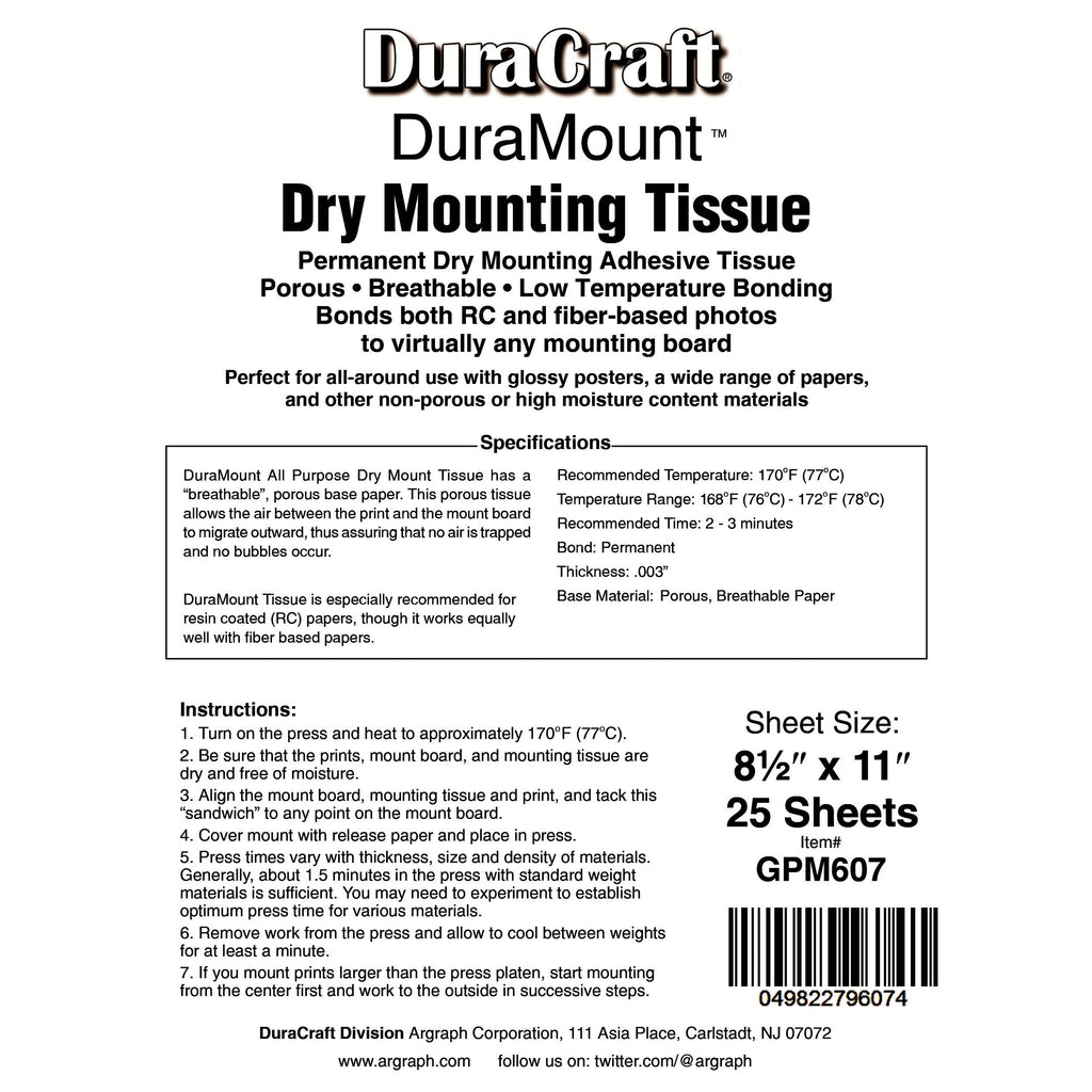 Duramount Dry Mount Tissue by Duracraft provides a quick, safe, and permanent way of mounting prints at lower press temperatures. Duramount is especially recommended for RC (Resin Coated) papers though it works equally well with fiber paper. The adhesive is neutral pH and serves as an inhibitor to prevent acid migration.