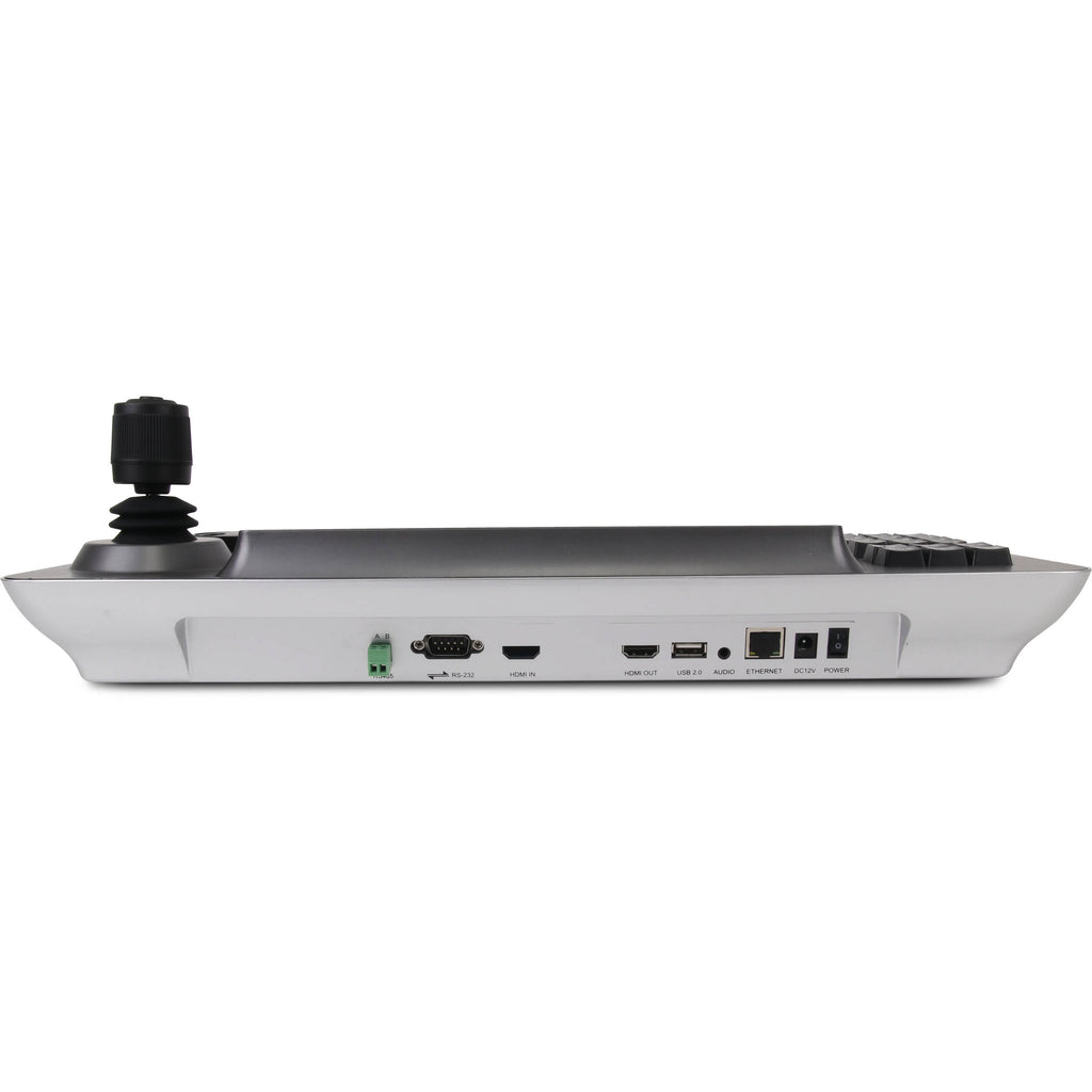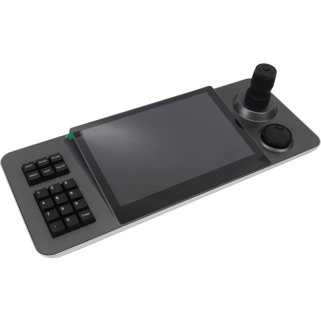This DVDO PTZ Camera Controller with Touchscreen & Joystick is suitable for use in schools, hospitals, hotels, businesses, and any set up for where unified control is desirable for multiple network cameras that are installed. The network-based touch keyboard features a 10.1" capacitive touchscreen and simple user interface. The integrated touchscreen can provide real-time previews from camera feeds, supporting up to four screen partitions, and it can output the image to an external display via HDMI. It supports single viewing of H.265 4K at 30fps or H.264 1080p at 60fps as well as four-channels of 720p at 30fps video. The system includes a joystick for PTZ control, and it also supports an external mouse if you are more comfortable working that way.