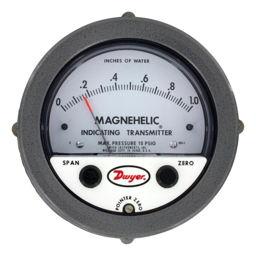 605-0 is a series 605 Magnehelic® differential pressure indicating transmitter provides for both visual monitoring and electronic control of very low differential pressure. The series 605 is ideal for control applications in building HVAC systems where local indication is desired during routine maintenance checks or necessary when trouble shooting the system. The easily read dial gauge is complimented by the 2-wire, 4-20mA control signal utilizing the time-proven Dwyer® Magnehelic® gauge mechanical design and series 600 transmitter technology. The 2-wire design with terminal strip on the rear simplifies connection in any 4-20 mA control loop powered by a 10-35VDC supply.