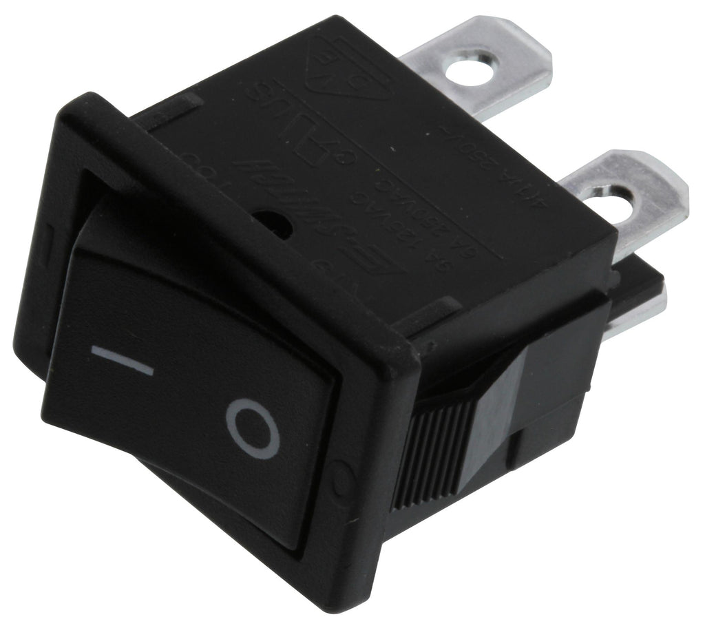 This is a R1973BBLKBLKFF0 ROCKER SWITCH , DPST, 9A, 125VAC, BLACK product from E-SWITCH with the model number R1973BBLKBLKFF0