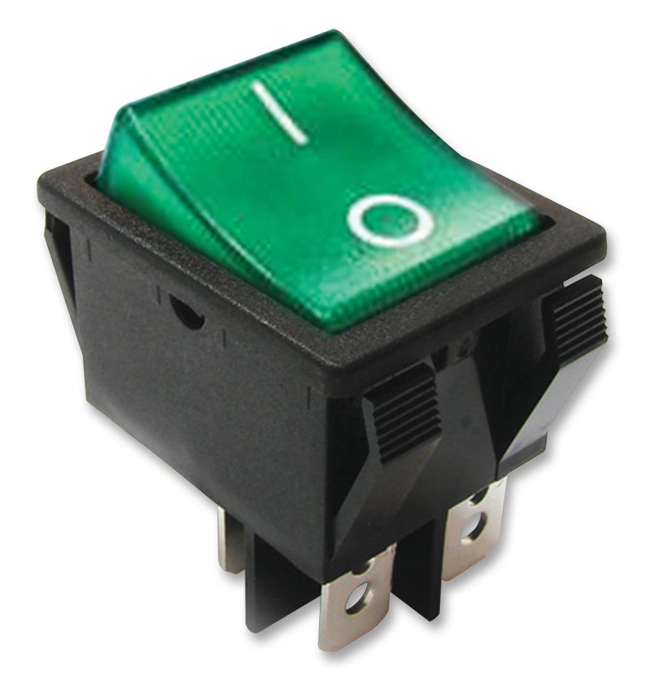 This is a SWITCH, ROCKER, DPST, 20A, 125VAC, GREEN product from E-SWITCH with the model number R5BBLKGRNFF2