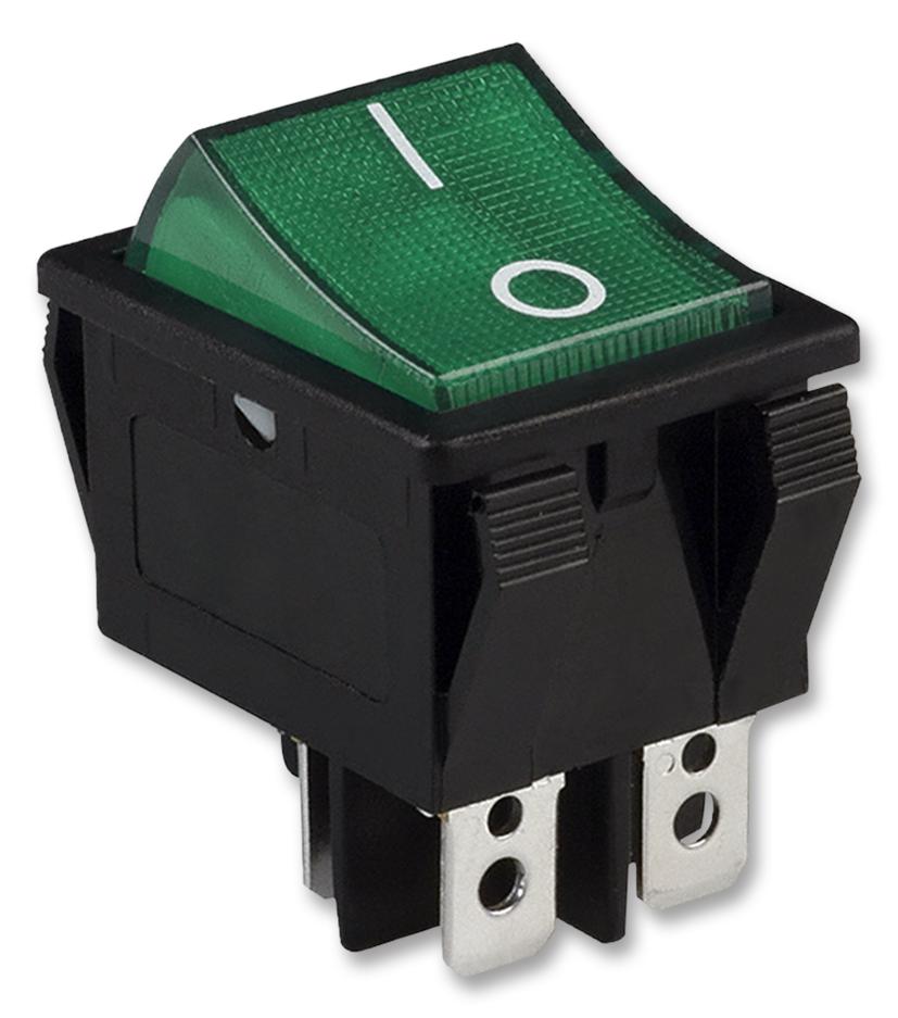 This is a SWITCH, ROCKER, DPST, 20A, 125VAC, BLACK product from E-SWITCH with the model number R5BBLKGRNFF3