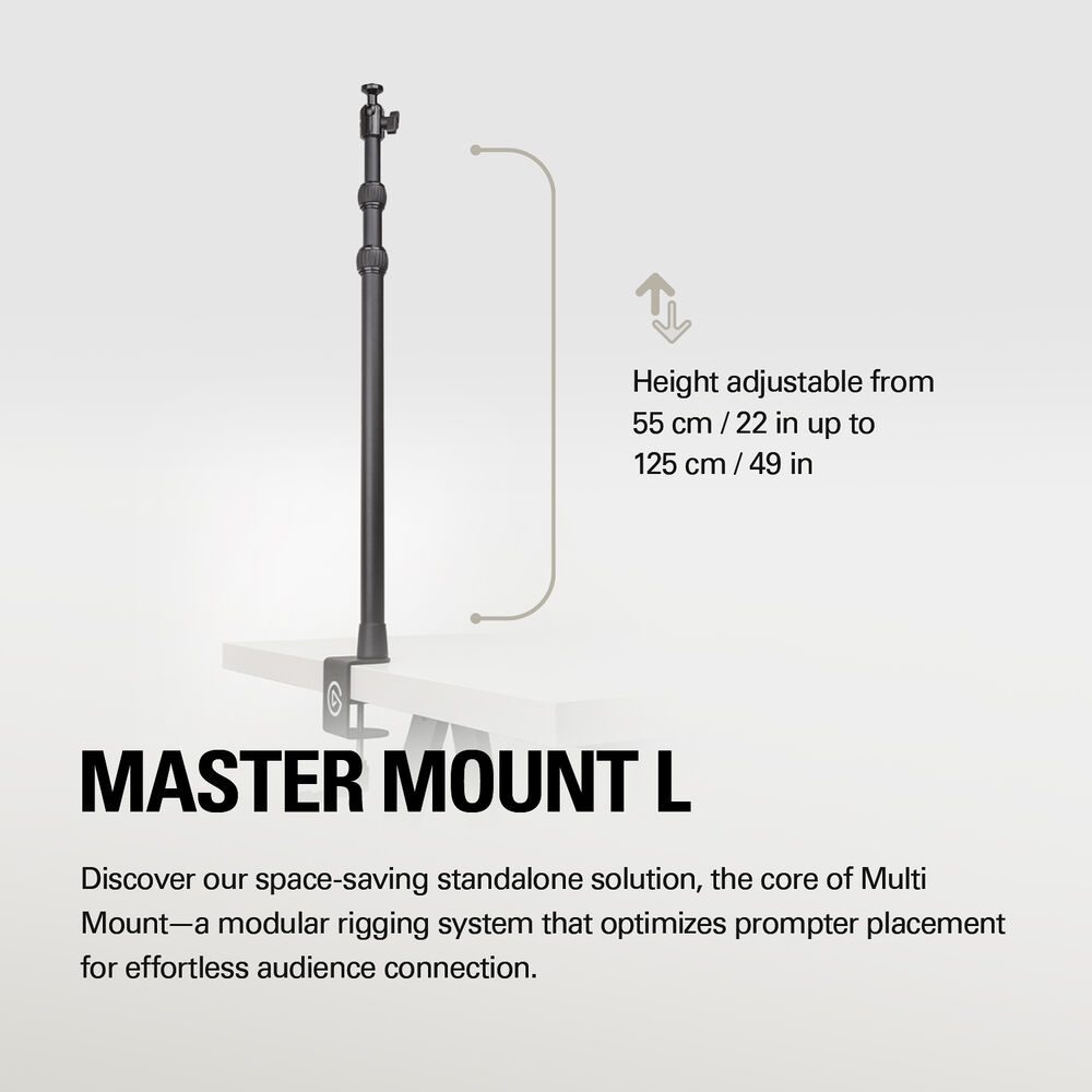 The Master Mount L from Elgato is the core of Elgato's versatile Multi Mount Modular Rigging System. Clamp it to a desk, and secure your gear to the 1/4"-20 ball head on top. You can also remove the clamp and attach the Master Mount to an optional Heavy Base.