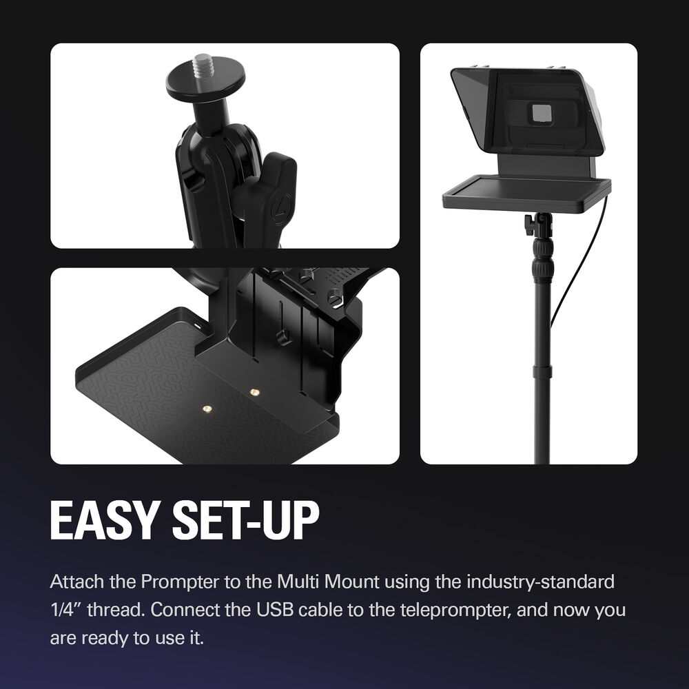 - With two 1/4"-20 threads on the base, Prompter attaches to your desktop mount or tripod with ease