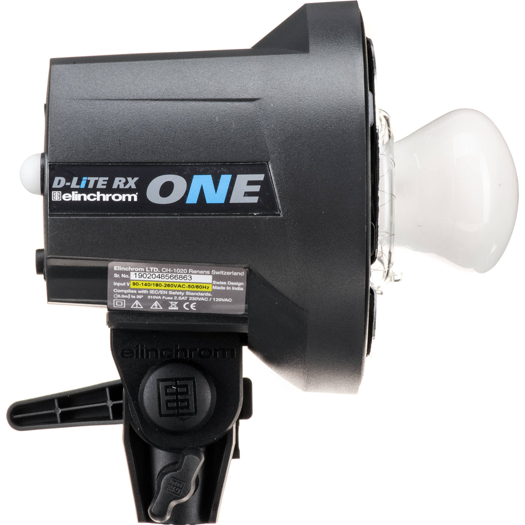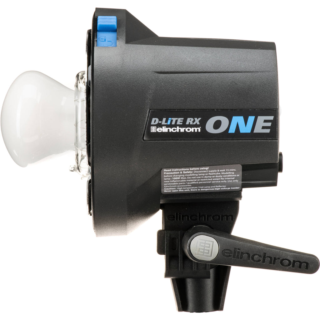 D-Lite RX One's bayonet mount accepts all Elinchrom accessories and softboxes up to 53" (135 cm). It comes with a power cord with a U.S. plug, sync cord, flash tube and protective cap. The included 115V 100W modeling lamp must be swapped out when using the unit in nominal 230V electrical environments.