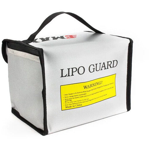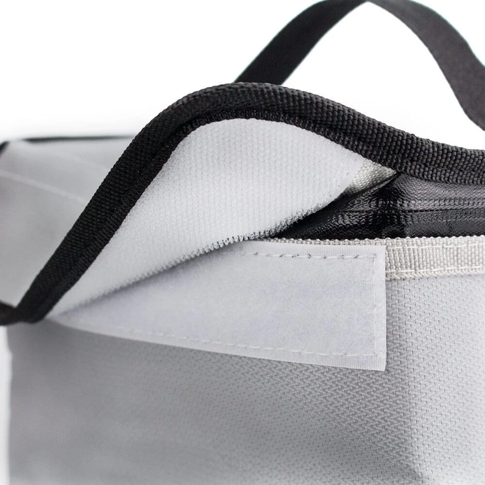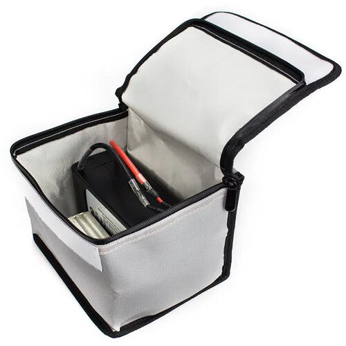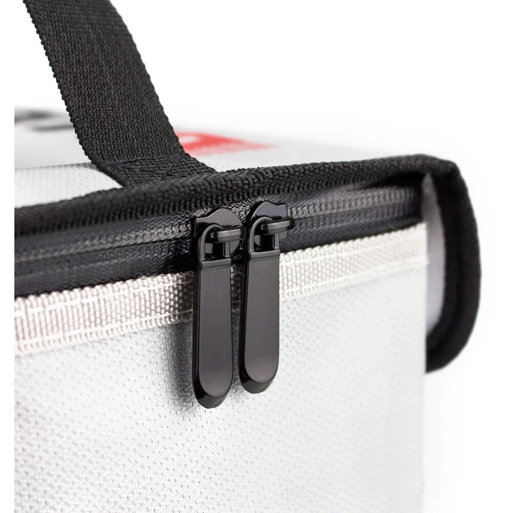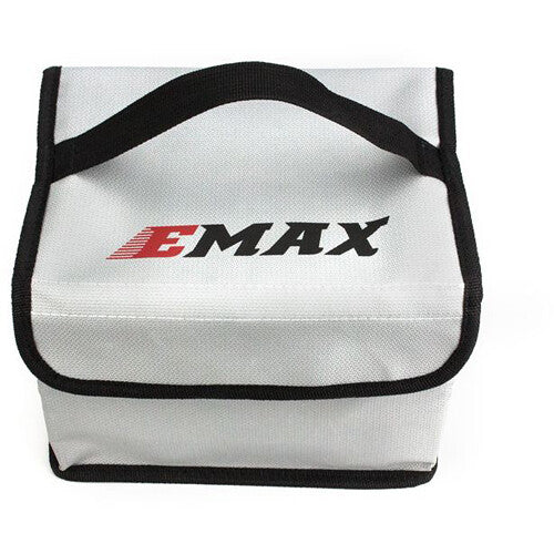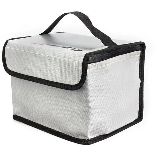 Carry your LiPo batteries safely and securely with this white, flame-resistant LiPo Battery Safety Bag from EMAX. Made from durable fiberglass woven fabric, this 7.8 x 5.9 x 5.9" bag is constructed to be explosion resistant, helping protect other gear stored near the bag in case an incident occurs. The zippered lid keeps your batteries inside, and a reflective handle helps you find the bag in dim environments. It is suitable for RC planes and drones.