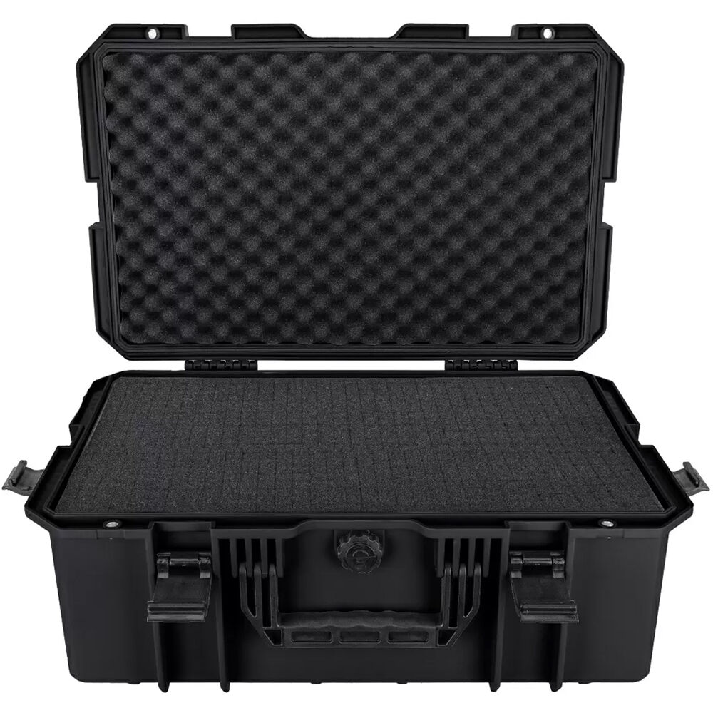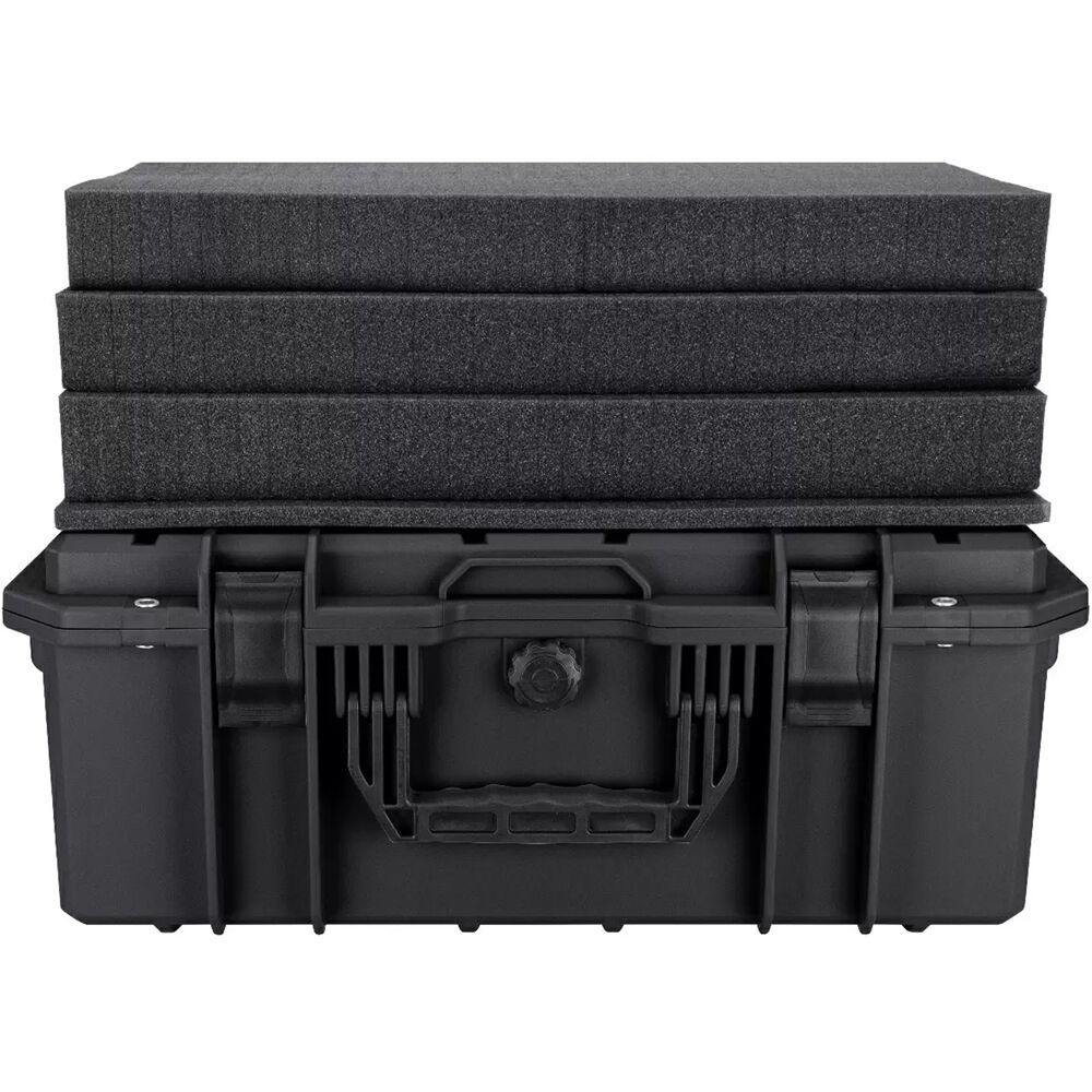 Keep your sensitive equipment protected during travel and storage in the Intact Stacker Standard Hard Case with Foam from Eylar. This 21.6 x 13.7 x 8.6" carry-on case has a durable, reinforced polypropylene plastic shell to protect against scuffs and impacts. The five layers of padded interior foam cushion your contents, and the integrated handle offers comfortable carrying. The stackable design makes it easy to store multiple cases. The case accepts two user-supplied padlocks for added security.