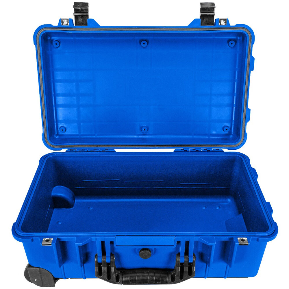 The Carry-On Roller Hard Case with Foam from Eylar is made from rugged shock, dust, and waterproof polypropylene for optimal equipment protection. This 22" case accommodates most full-size laptops and cameras with space for power cables and accessories. It has a folding top and side handles, a retractable handle, sturdy wheels, and a pressure relief valve. The ABS latches are held in place with steel pins, and the case accepts two user-supplied padlocks for added security. The four-piece interior foam set is customizable to accommodate virtually any application.