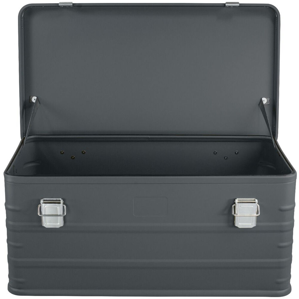 This gray 95-liter Large Crossover Aluminum Overland Storage Box from Eylar is an aluminum storage box featuring steel latches with padlock compatibility to keep your gear secure. Reinforced corners provide extra protection to the contents and make stacking the boxes easier.The box has an IP5 weather-resistance and dustproof rating and features an O-ring. The spring-loaded, low-profile handles feature rubber coatings for comfortable carrying.
