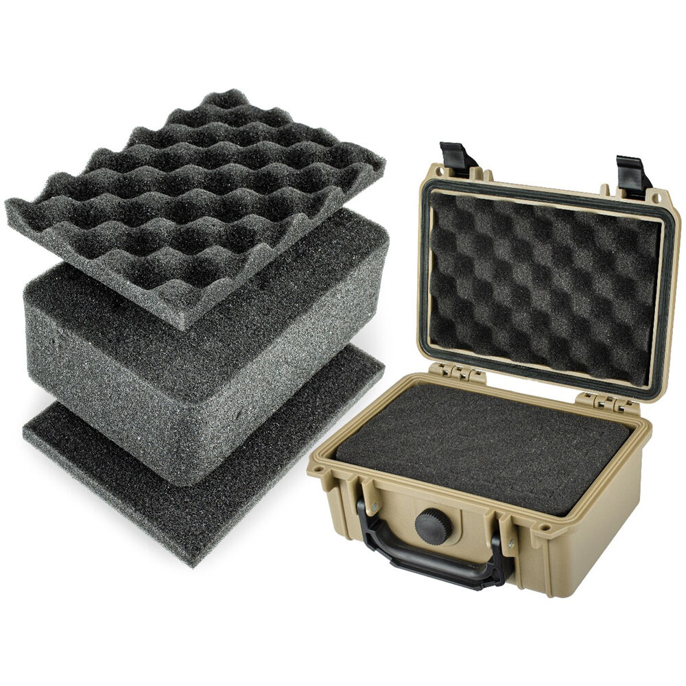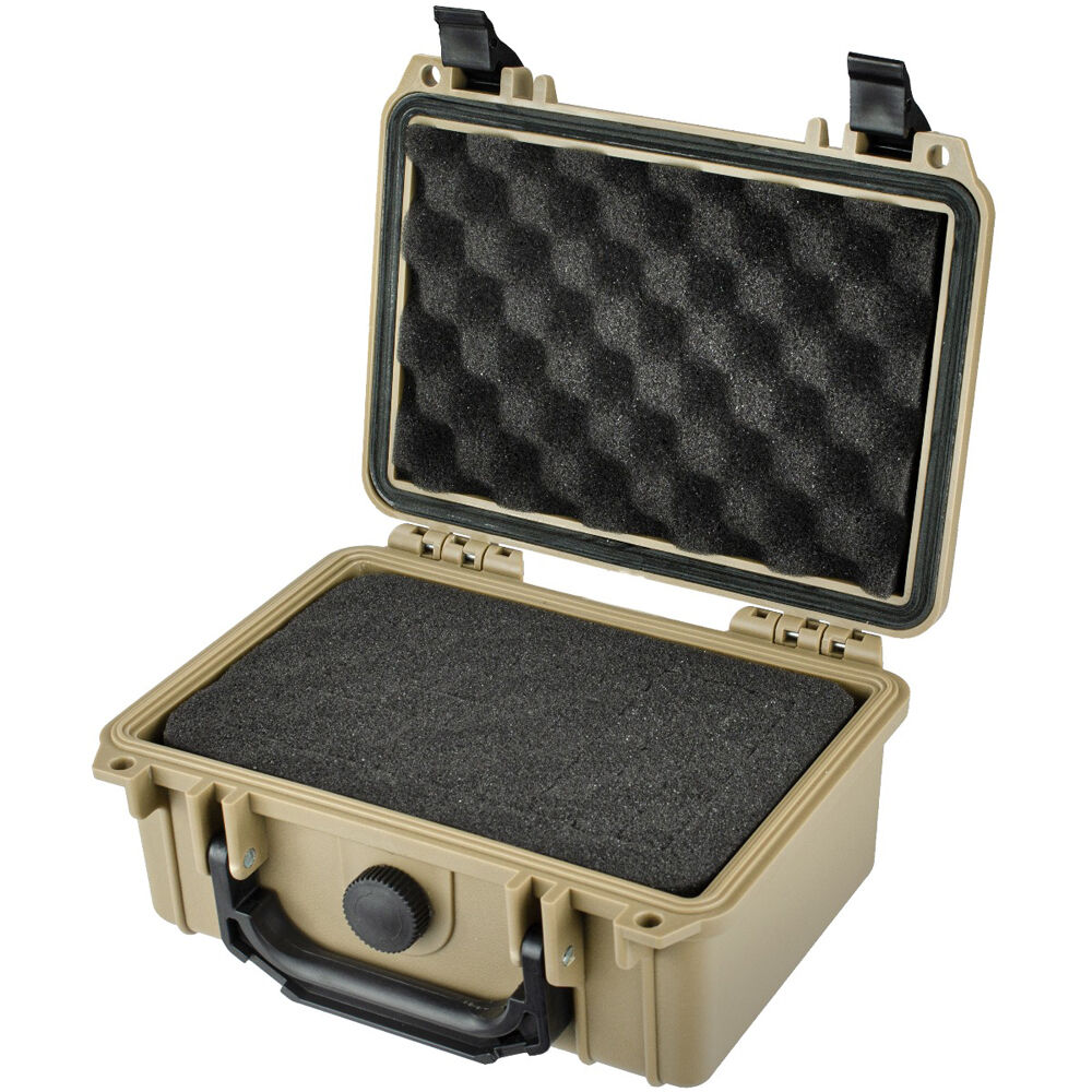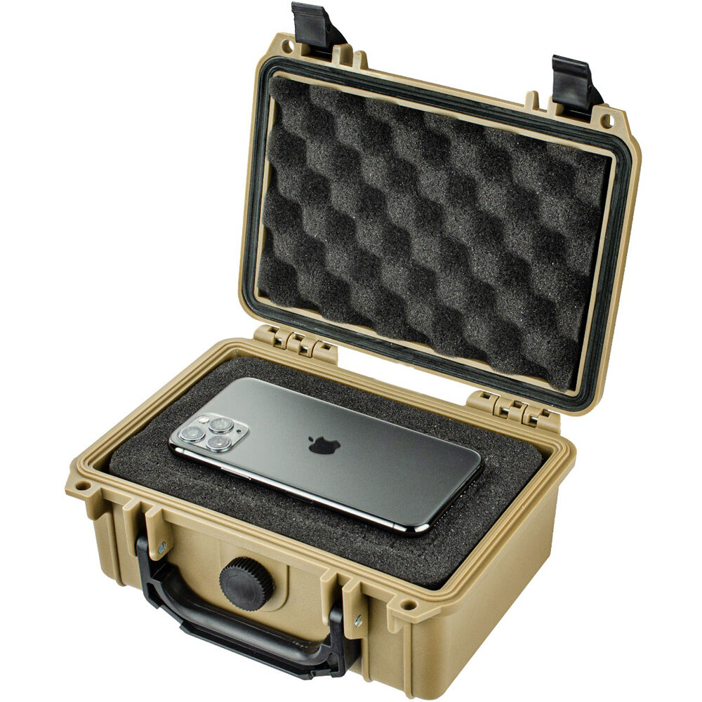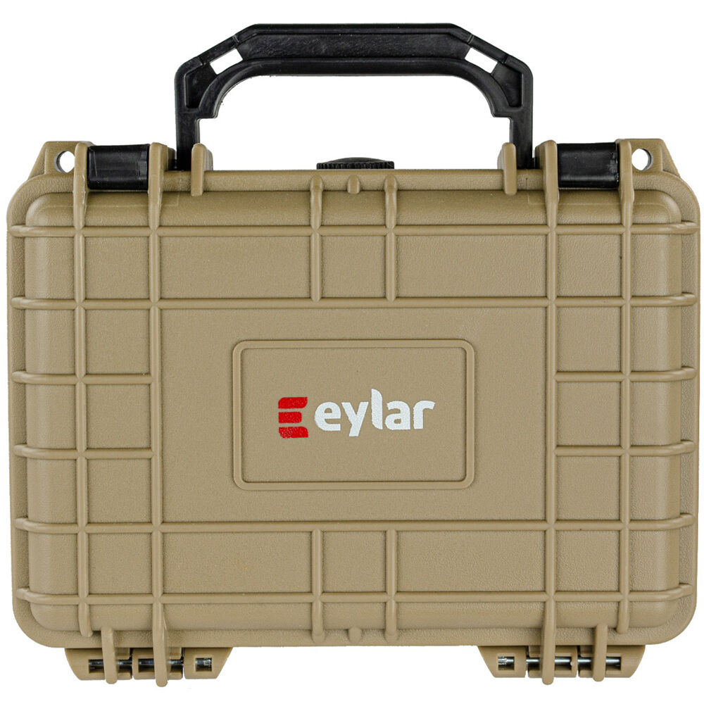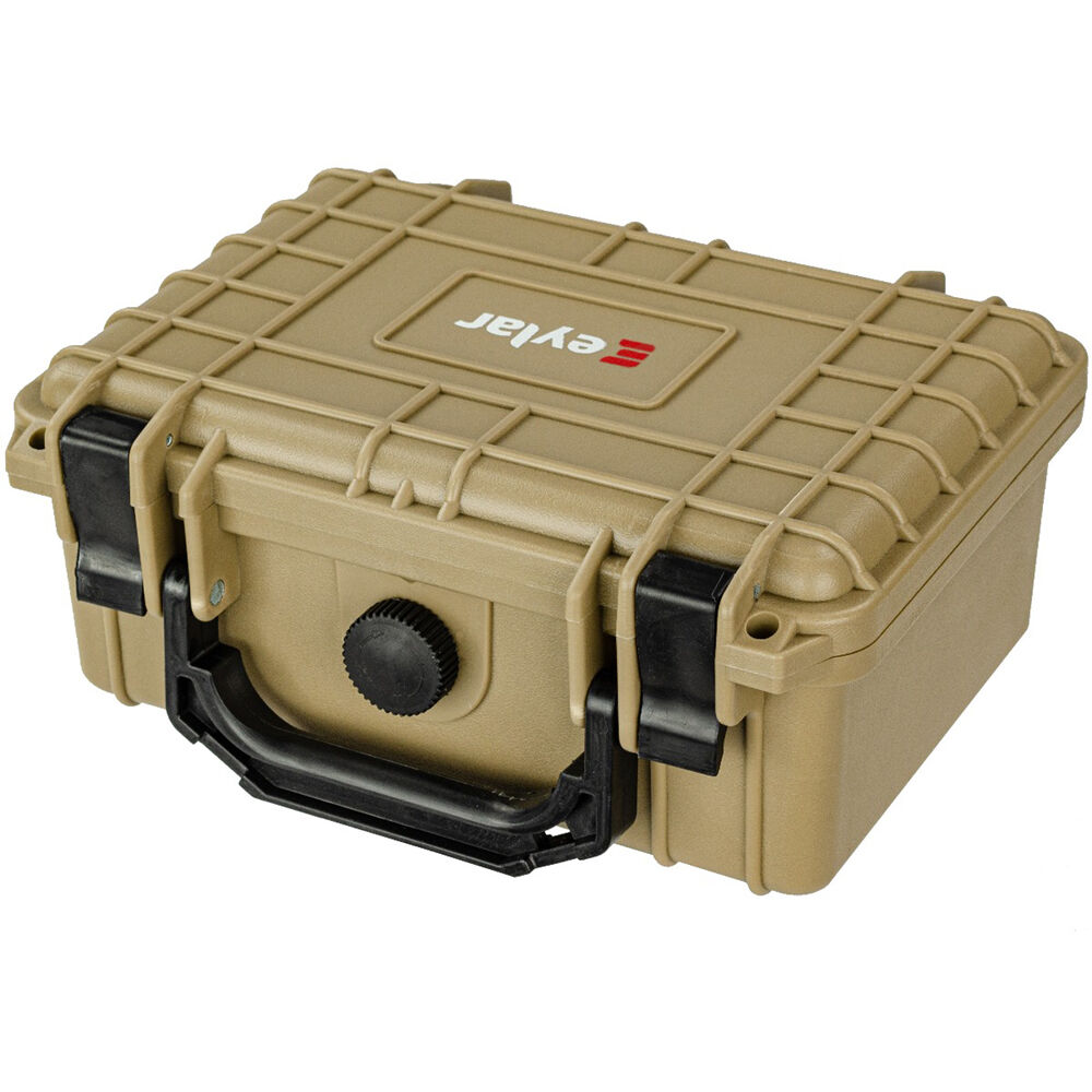 This tan 8" Small Case with Foam from Eylar is a compact hard protective case that is strong and makes storing belonging easier. With one customizable pluck-and-pull foam layer, one top egg crate, one bottom pad layer, it meets everyday needs. A small handle folds out for easy lifting and folds in for easy storing. This case is great for storing small cameras, small electronics, and jewelry, and its compact size and integrated pressure-equalizing valve makes it perfect for travel.