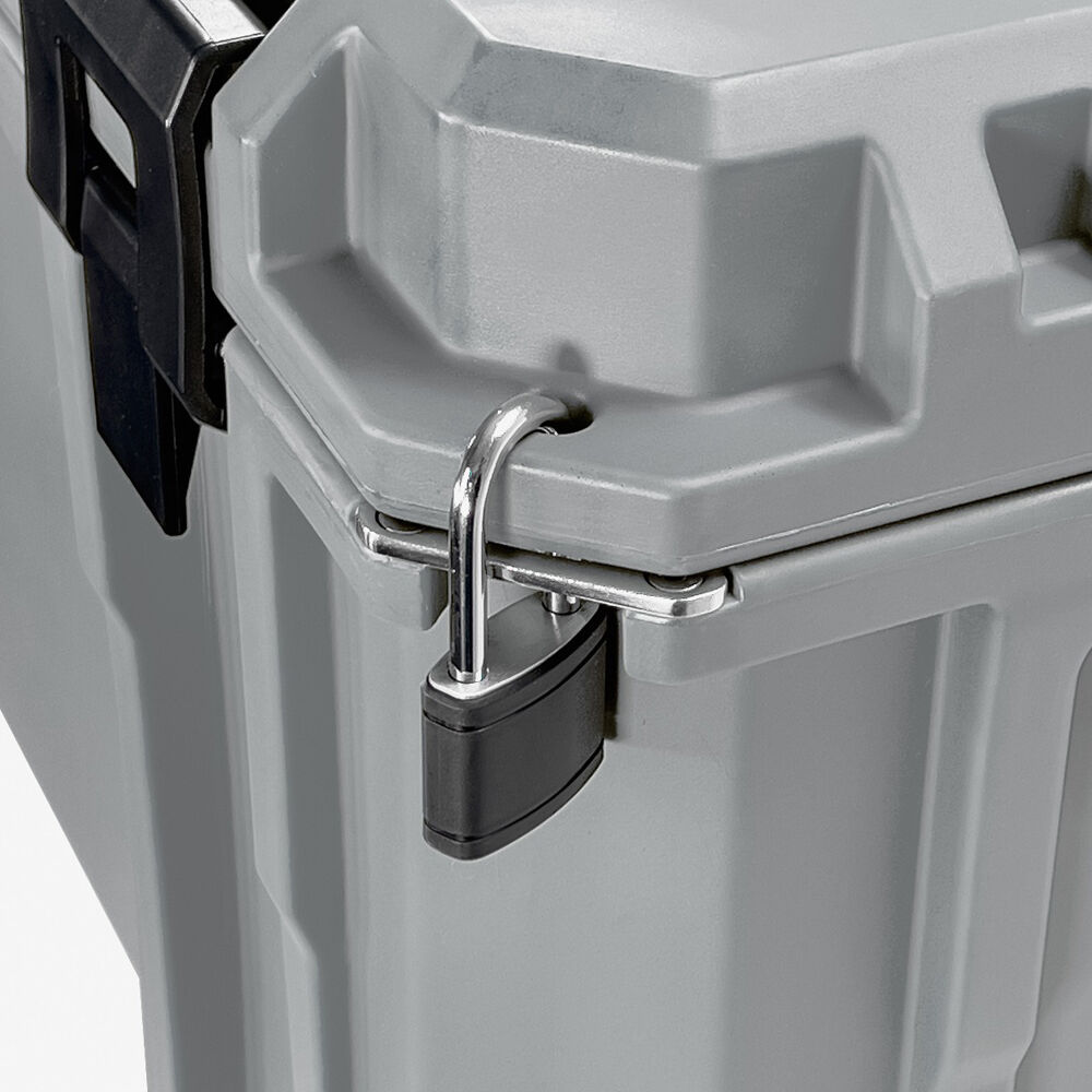 This gray 90 liter Eylar SR-90 Large Crossover Overland Roto-Molded Cargo Case is designed to elevate your off-roading experience. The roto-molded case is built lightweight and strong, making it perfect for any outdoor adventure. Its stackable design allows cases of the same size to stack on top of each other. Strapping anchor slots on all 4 sides allow the cases to be tied down for secure transport with top access to the lid. This case features padded side handles, can hold up to 220 pounds, and is heat resistant up to 212°F.