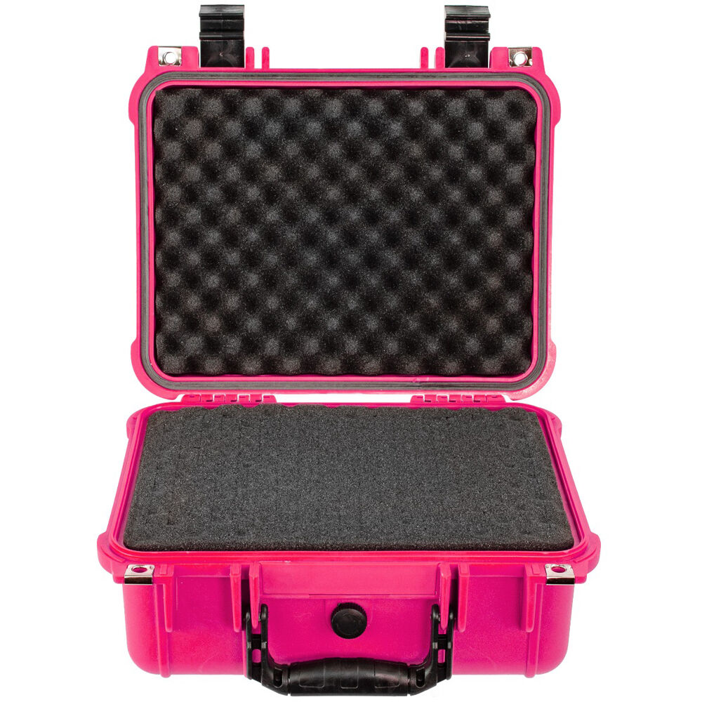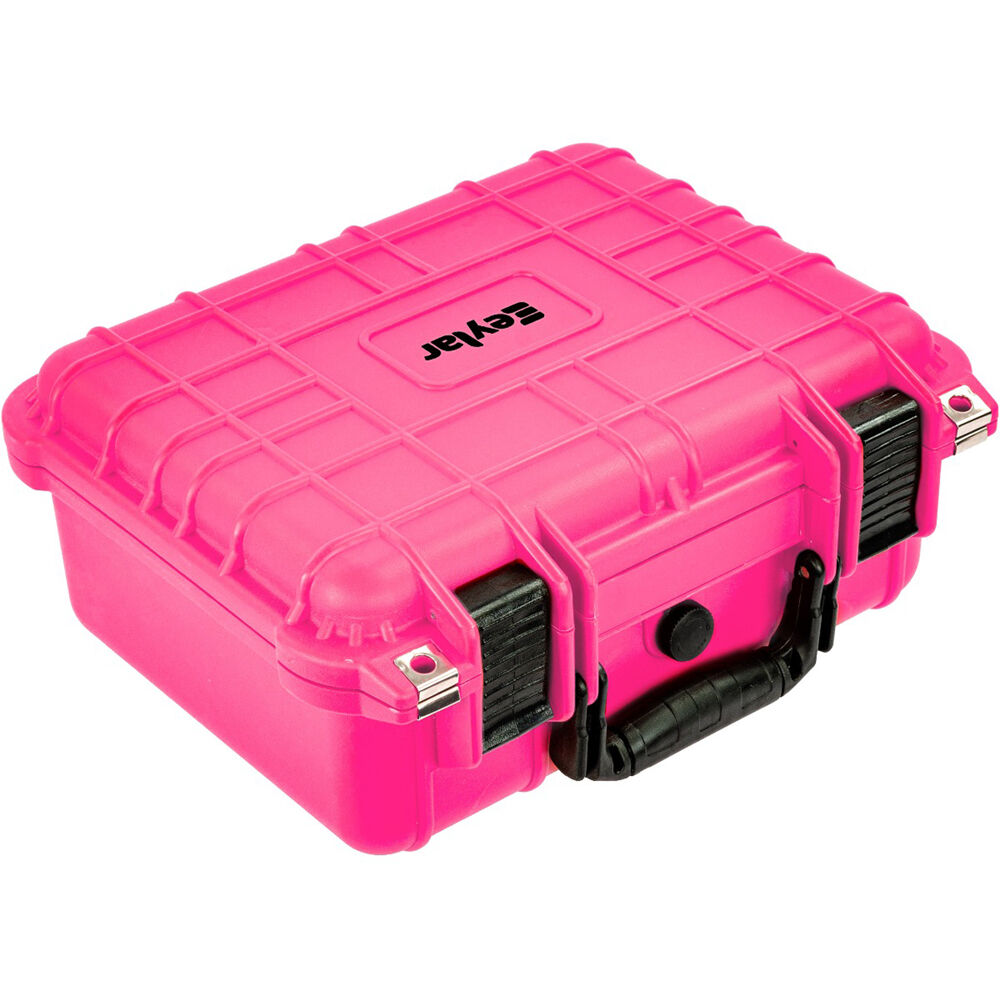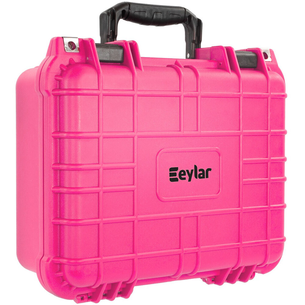 The 13.4" pink Eylar Standard-Sized Gear Case has internal dimensions of 5.2 x 8.8 x 11.8" and is designed to secure your equipment for transport or storage. The case's reinforced polypropylene plastic build is water, dust, shock, and crushproof. An integrated adaptive pressure-equalization valve releases built-up air pressure, allowing for atmospheric equalization when transported to high or low altitudes, as well as when transported inside cargo vacuums. This hard case comes with two layers of easily customizable pull-and-pluck foam to match the shape of the equipment you want to store, a bottom lining padding layer, and a top egg crate foam layer. Two push-pull latches secure the entire length of the hard case, and two adaptable padlock accessories allow for secure storage at home or on the go.