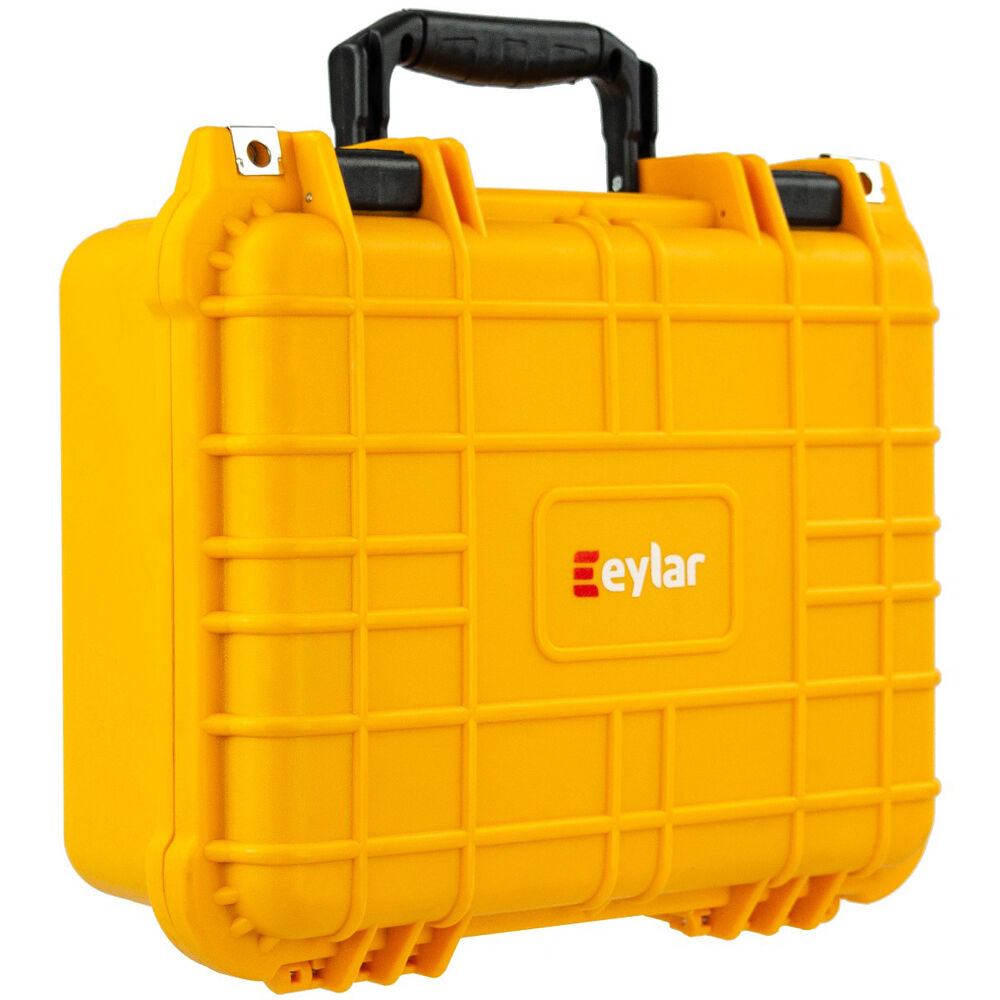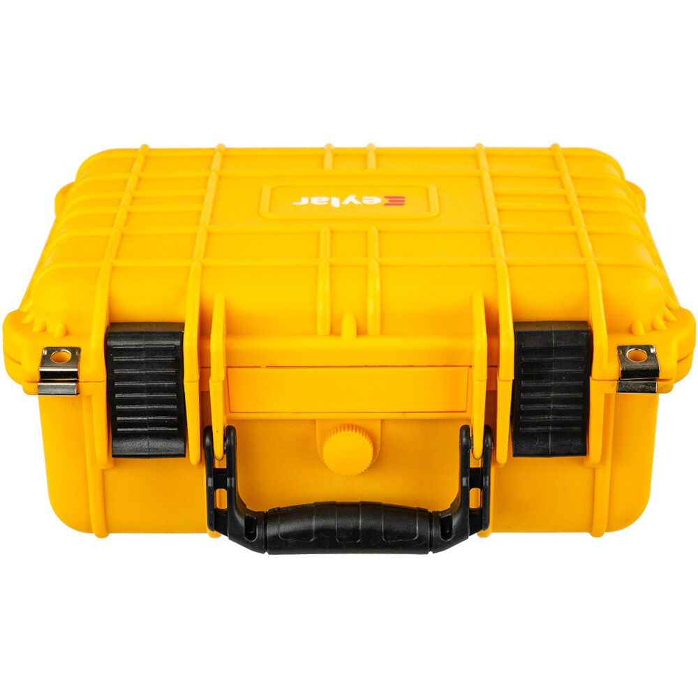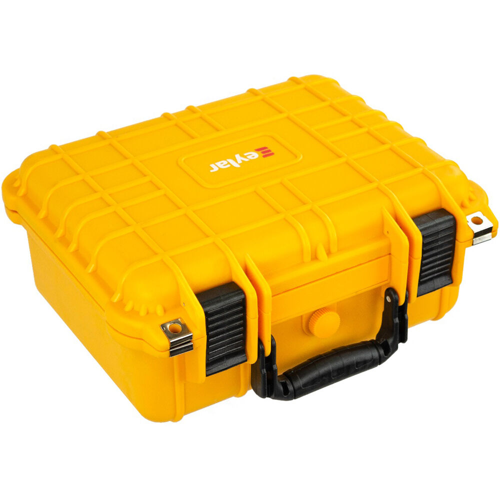 The 13.4" yellow Eylar Standard-Sized Gear Case has internal dimensions of 5.2 x 8.8 x 11.8" and is designed to secure your equipment for transport or storage. The case's reinforced polypropylene plastic build is water, dust, shock, and crushproof. An integrated adaptive pressure-equalization valve releases built-up air pressure, allowing for atmospheric equalization when transported to high or low altitudes, as well as when transported inside cargo vacuums. This hard case comes with two layers of easily customizable pull-and-pluck foam to match the shape of the equipment you want to store, a bottom lining padding layer, and a top egg crate foam layer. Two push-pull latches secure the entire length of the hard case, and two adaptable padlock accessories allow for secure storage at home or on the go.