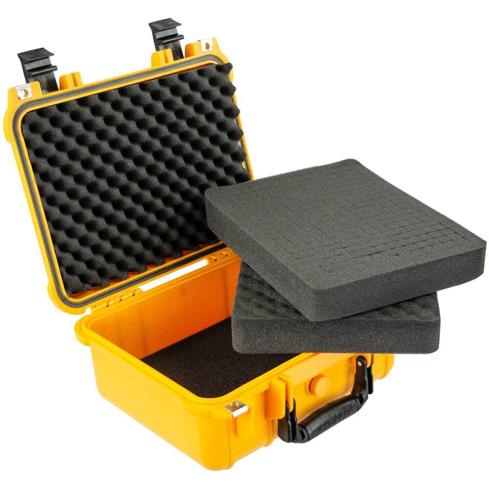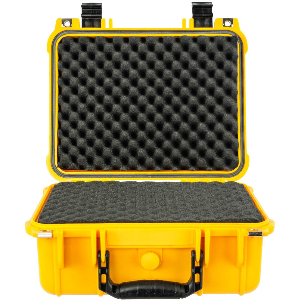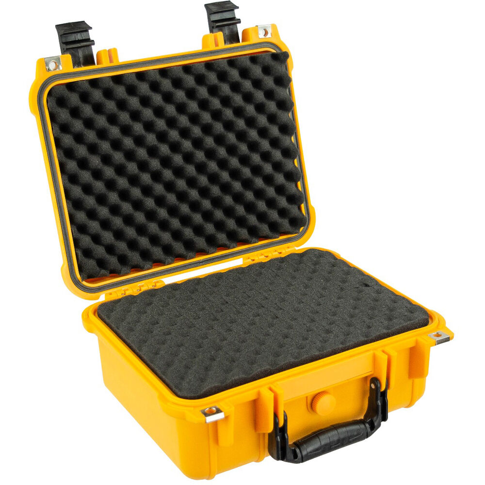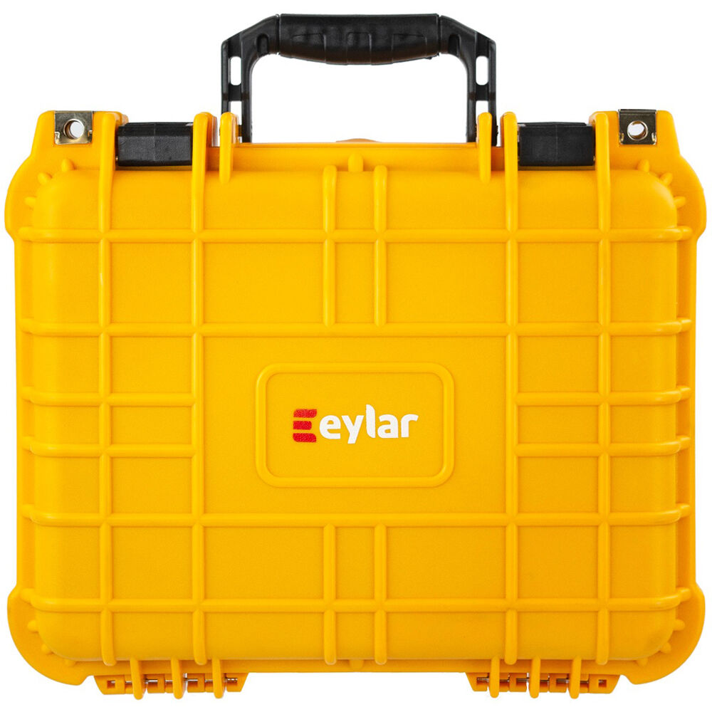 The 13.4" yellow Eylar Standard-Sized Gear Case has internal dimensions of 5.2 x 8.8 x 11.8" and is designed to secure your equipment for transport or storage. The case's reinforced polypropylene plastic build is water, dust, shock, and crushproof. An integrated adaptive pressure-equalization valve releases built-up air pressure, allowing for atmospheric equalization when transported to high or low altitudes, as well as when transported inside cargo vacuums. This hard case comes with two layers of easily customizable pull-and-pluck foam to match the shape of the equipment you want to store, a bottom lining padding layer, and a top egg crate foam layer. Two push-pull latches secure the entire length of the hard case, and two adaptable padlock accessories allow for secure storage at home or on the go.