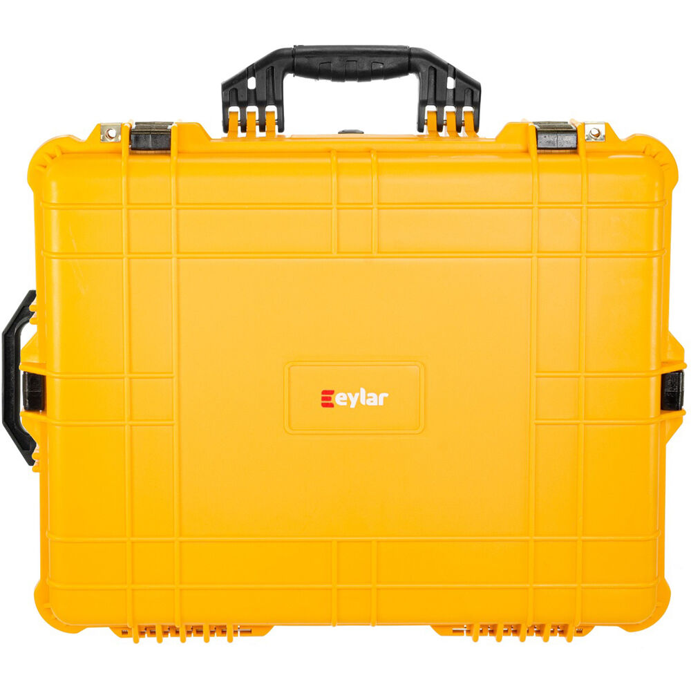 The yellow 24 inch Eylar XL Case with Foam is designed to be convenient and customizable. A tough exterior provides protection from impact, and a strong seal keeps the box water resistant. An integrated air pressure equalizer knob compensates for changes in pressure when travelling. Pluck-and-pull foam allows for custom compartmentalization that enables equipment to be stored neatly and securely. Clamps on the front and sides securely close the box, and crushproof handles provide easy carrying and uniform grooves allow for easy stacking.