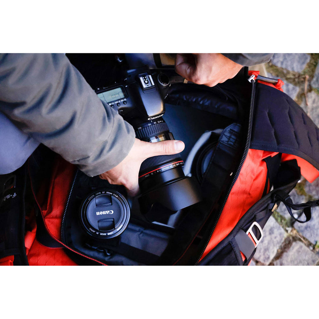 Comfortably transport, store, and protect your video and/or DSLR camera, lenses, and accessories with the red/orange AJNA DuraDiamond 37L Travel & Adventure Photo Backpack from f-stop.