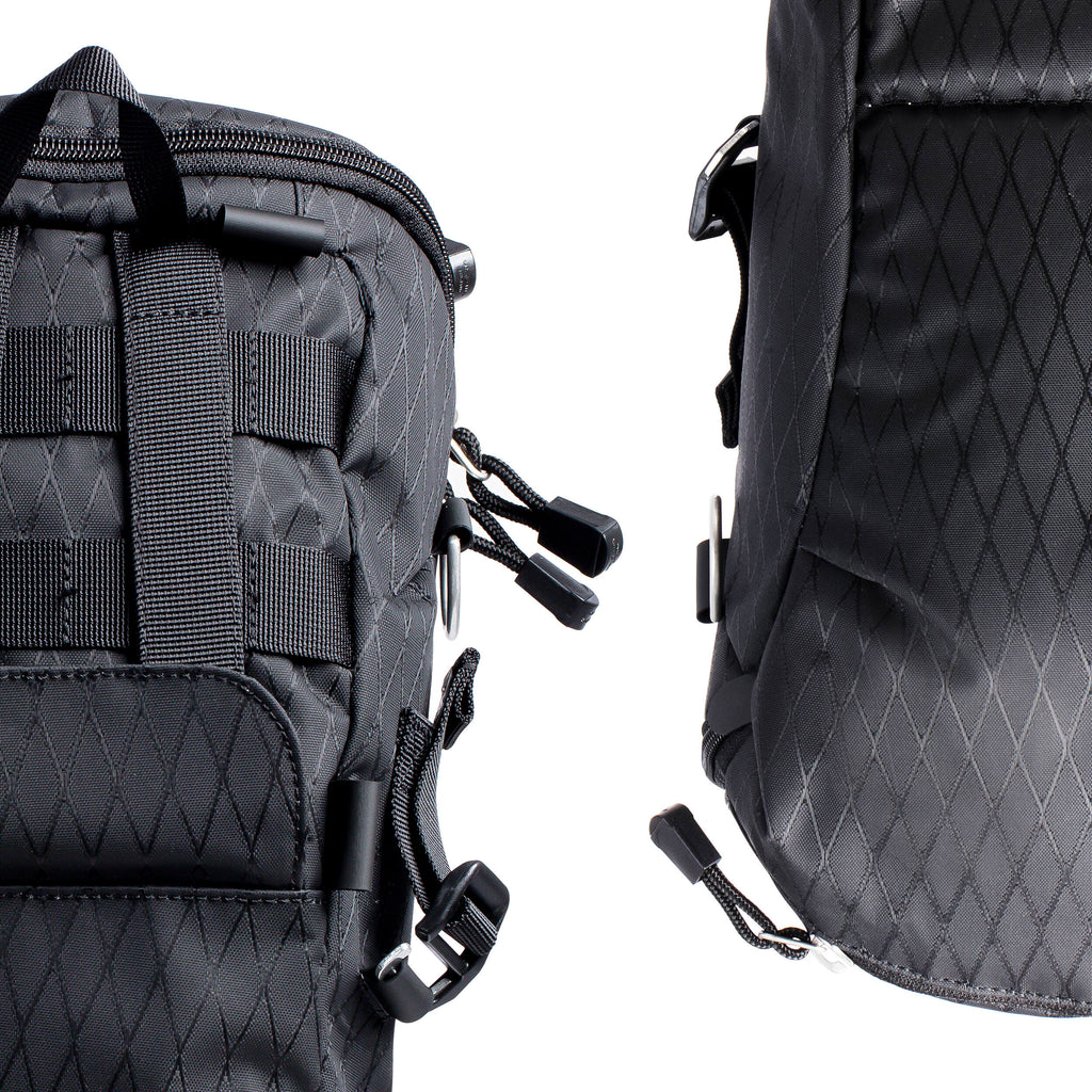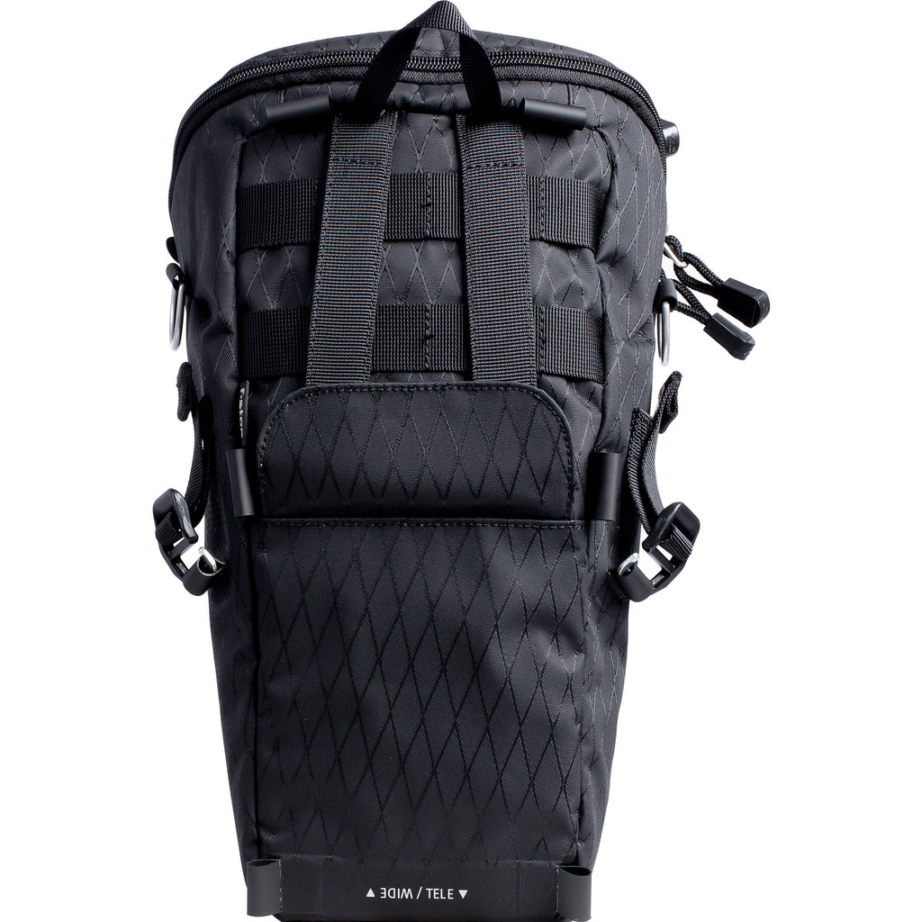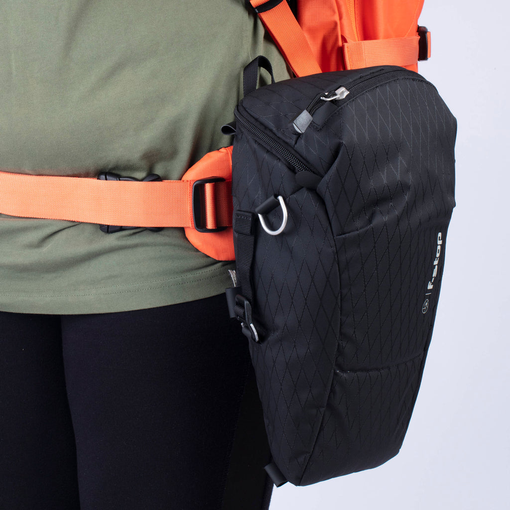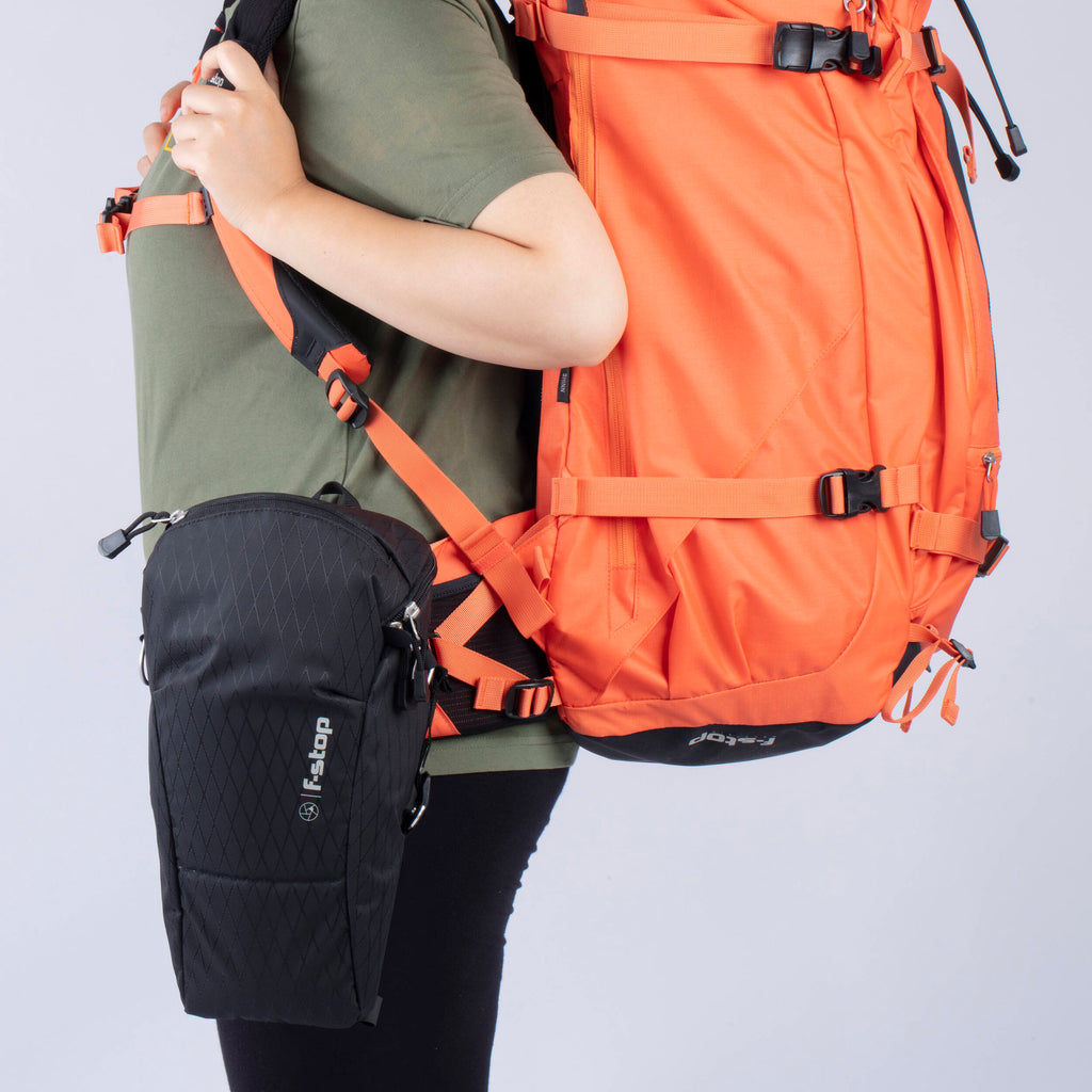 Its exterior is made of a durable proprietary waterproof nylon that offers superior rip and tear resistance, with strong welded seams and panels for durability and longevity. A removable shoulder strap lets you wear the bag as a stand-alone minimalist camera bag, and MOLLE straps on the back allow you to easily connect it to larger bags or belts. There are metal D-rings to mount it on f-stop's Mountain Series shoulder straps, and Gatekeeper attachment points allow you to wear it on your chest.