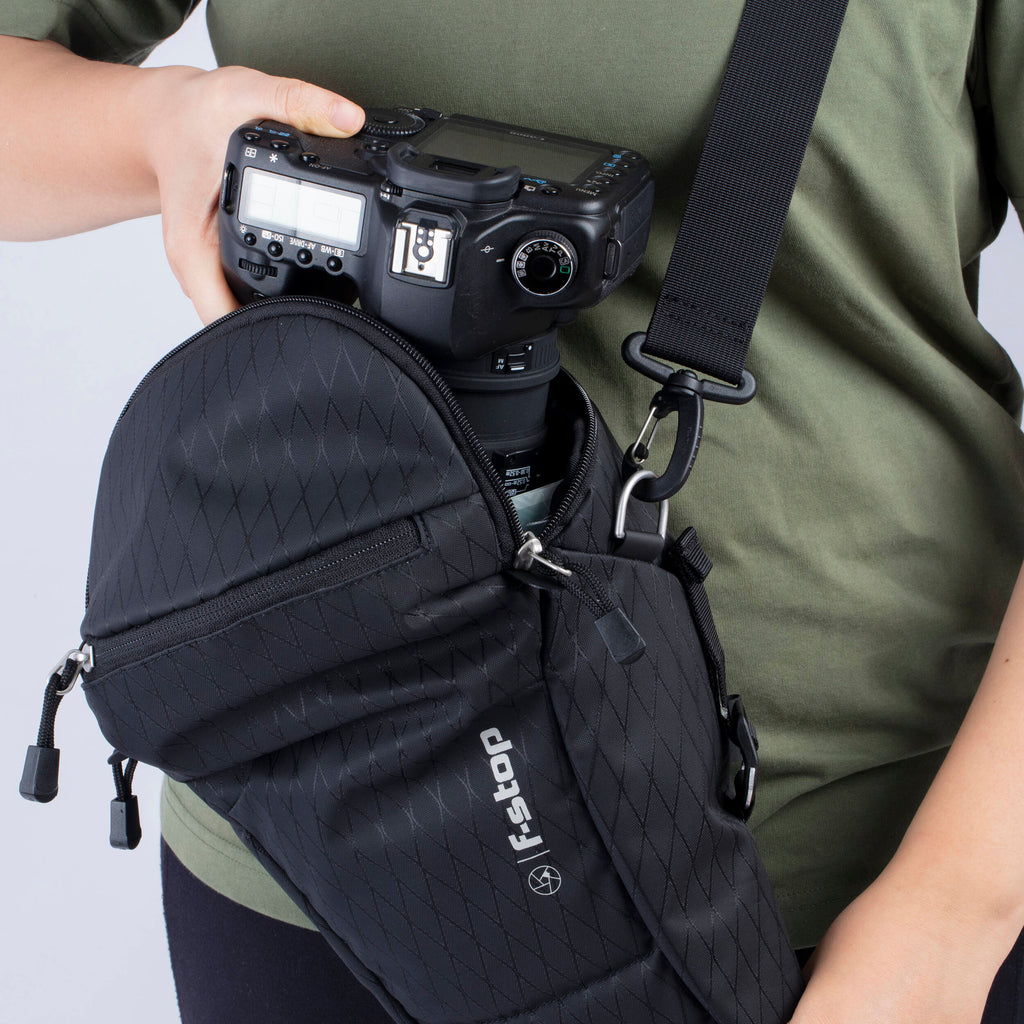 Flexible, Compact, and Built for SpeedHolds a DSLR with a Lens AttachedMultiple Carrying/Wearing ConfigurationsExpands to Hold a DSLR with a Large Lens Designed for those who need to move and shoot fast, the f-stop Gear Navin Welded Camera Pouch holds and protects your DSLR and larger attached lens with multiple ways to wear it based on your needs, preferences, or the other gear you've got to bring with you.