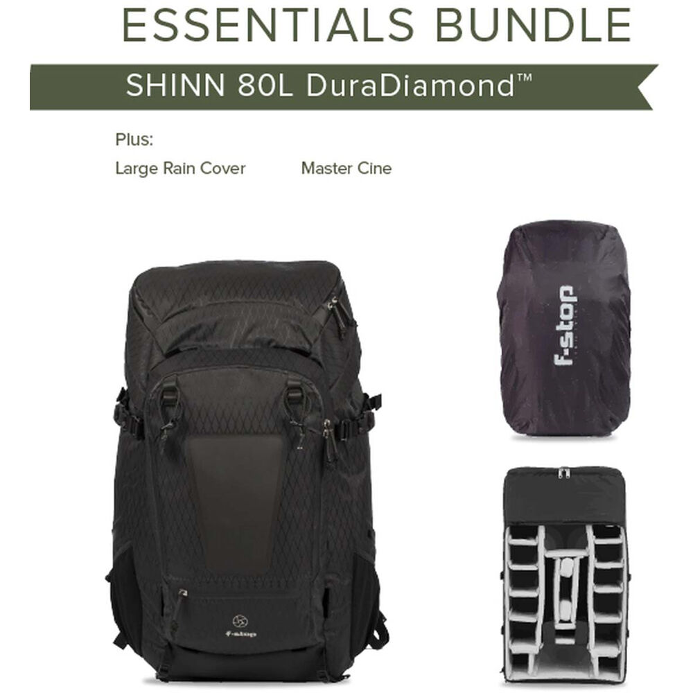 The f-stop Shinn DuraDiamond Expedition 80L Backpack Bundle, in black, combines the versatile Shinn backpack with a large cine ICU insert for organizing cameras, lenses, and accessories. An easily-attached rain cover is also included to help protect the pack's contents in inclement weather.