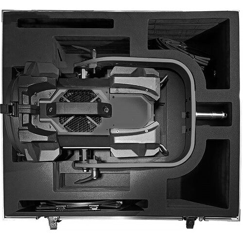 The Q10 Color-LR LED Light A1 Kit from Fiilex bundles a Q10 Color 900W LED Fresnel light with a durable rolling case with custom laser-cut foam interior and locking wheels with brakes. The light comes with a set of barndoors and an AC power cable.