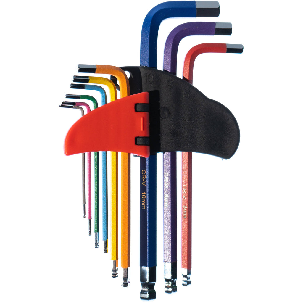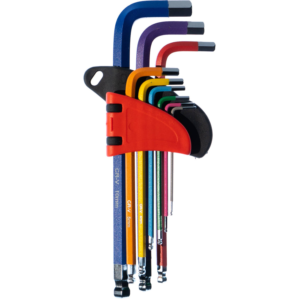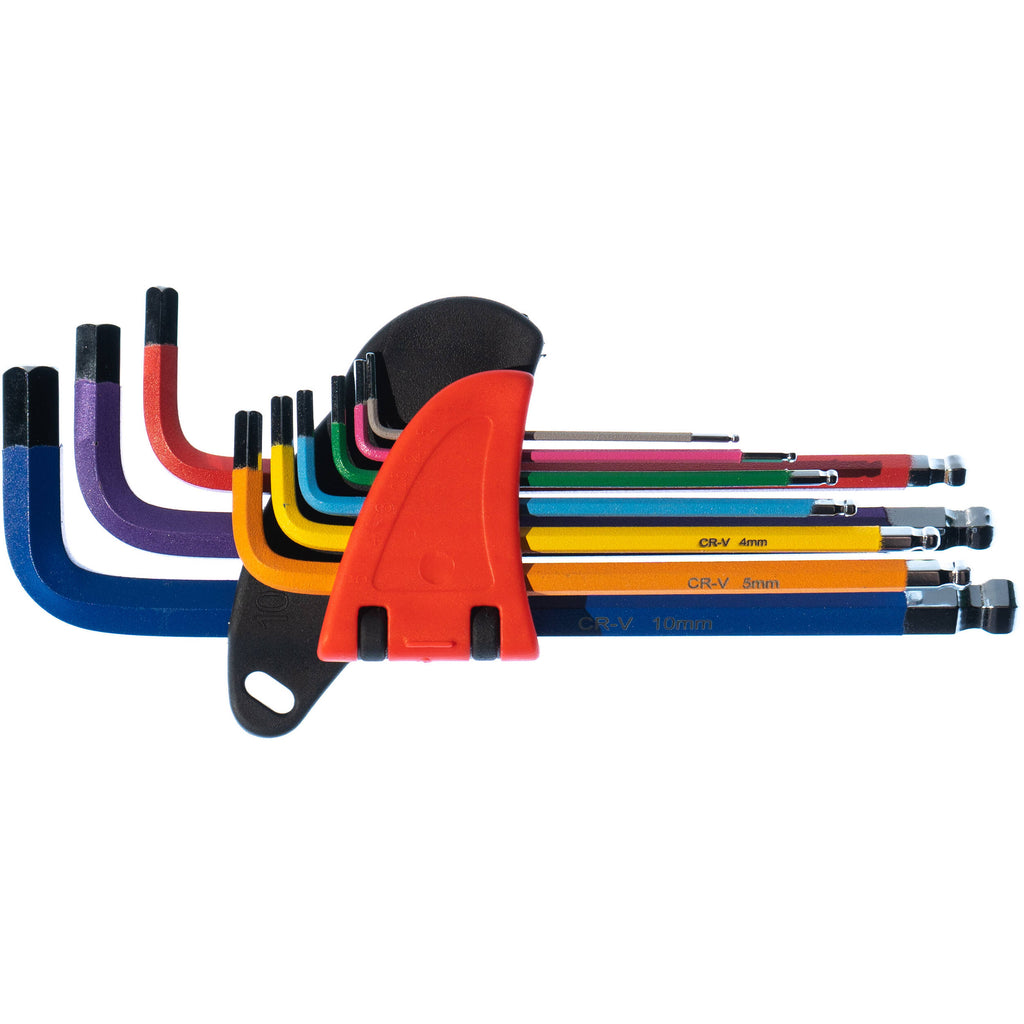 The nonslip color-coded coating helps with organizing and identifying which Allen key you need to use for a project. The head sizes available in this set are 1.5, 2, 2.5, 3, 4, 5, 6, 8, and 10mm. The Allen key holder features a hoop to attach either a large key ring or carabiner clip, so you never lose your set. The holder also folds in half, making it easy to store and travel with.