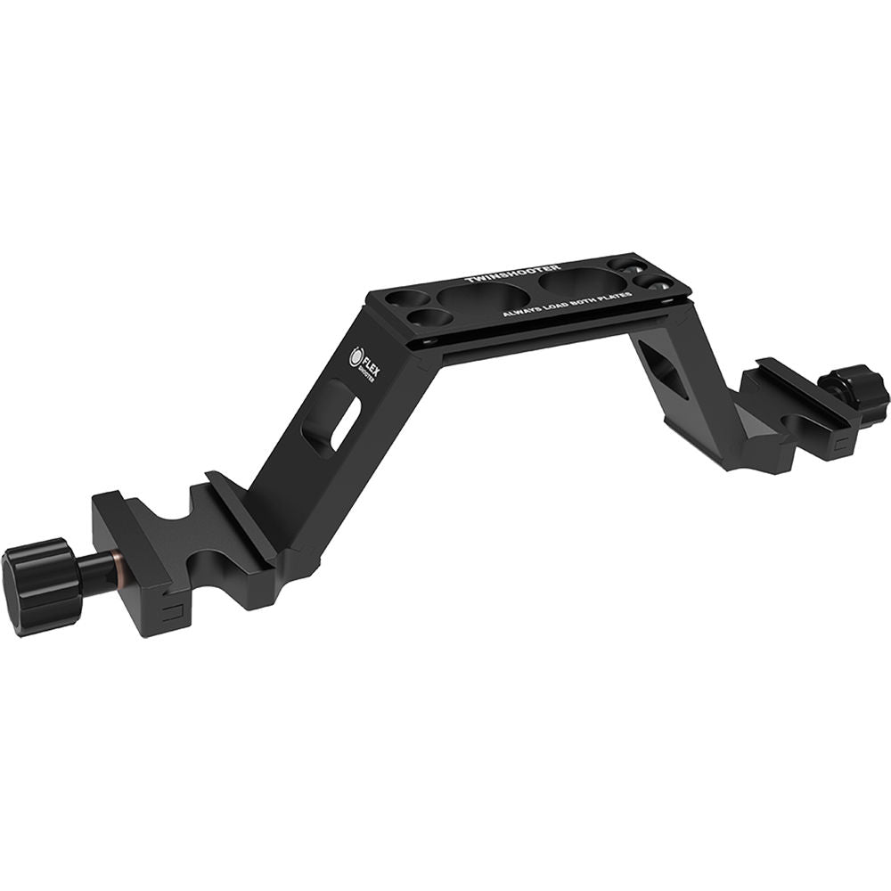The black anodized aluminum TwinShooter Mounting Plate from FlexShooter has double Arca-type clamps that allow you to mount two camera systems simultaneously and then mount the entire rig onto a compatible FlexShooter ball head. Having two camera setups provides the option of shooting with different focal lengths or shooting still while capturing video with the secondary camera.