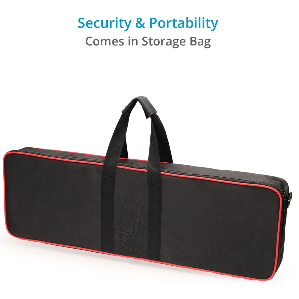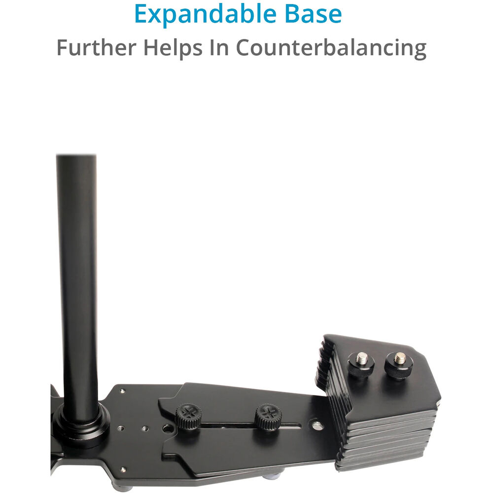 The base on the bottom features 16 thin weight plates that can be used or removed to find the ideal counterbalance for your camera load, in order to ensure optimal stabilization. The base can also be expanded in width to further help with counterbalance. And the center post is height-adjustable telescopically, from 21 to 32", for vertical counterbalance.