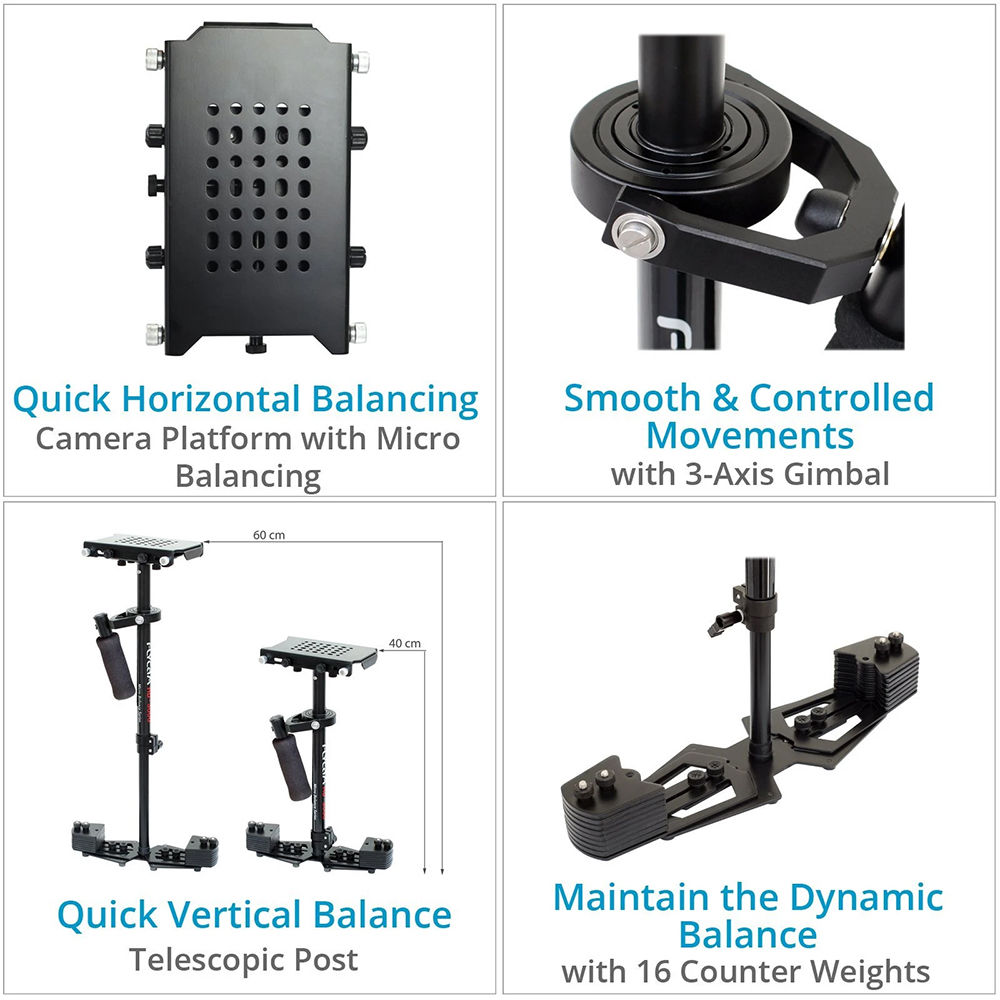 It comes with sixteen counterweights that stack onto the adjustable base to ensure a perfect balance. A table clamp provides a mounting point for the gimbal for balancing and for storing the balanced, assembled gimbal when not in use.
