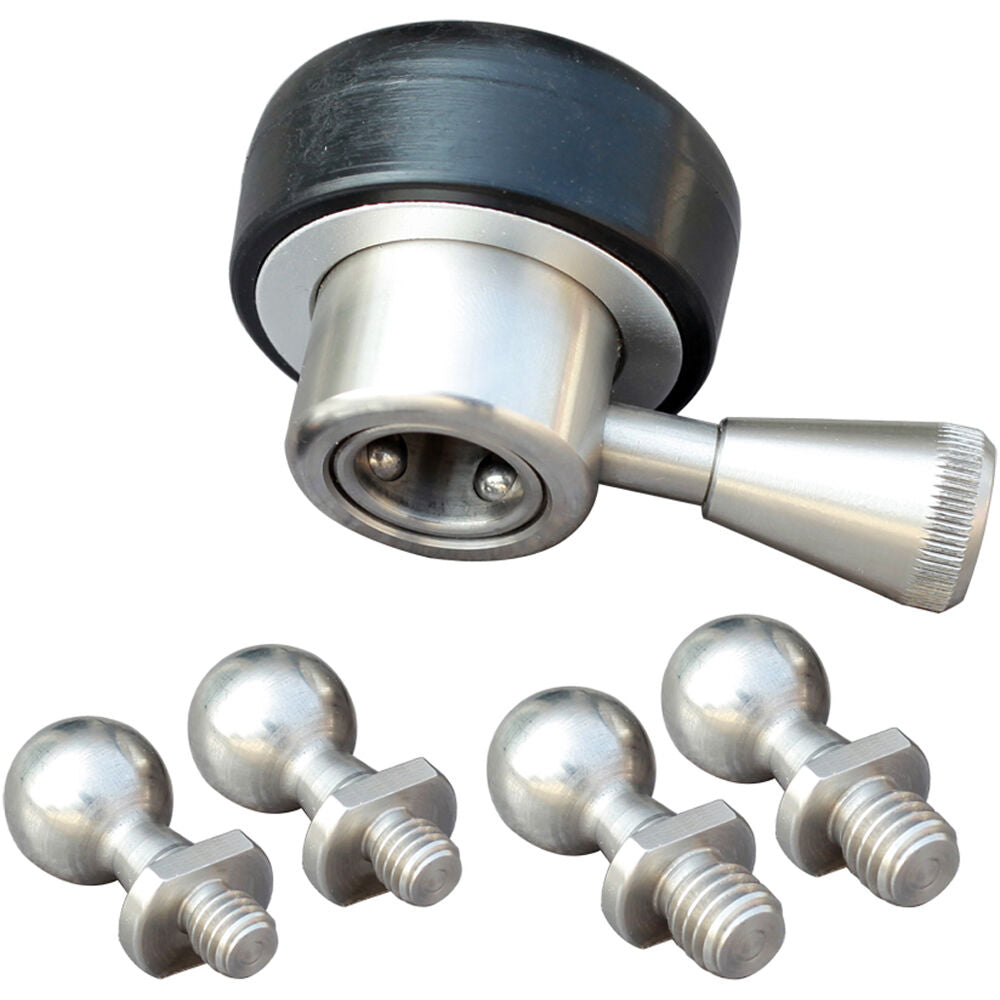 The hook comes with four ball studs�two with 1/4"-20 screws and two 3/8"-16 screws�to mount on just about any camera, cage, or rig with 1/4"-20 or 3/8"-16 threads on top. The quick release head attaches to the suspension cable on the rig, and the quick release catch mounts onto the ball stud. A thumbscrew ensures a solid connection that supports rigs up to 255 lb. To release, simply loosen the thumbscrew and pop the ball stud out of the head.