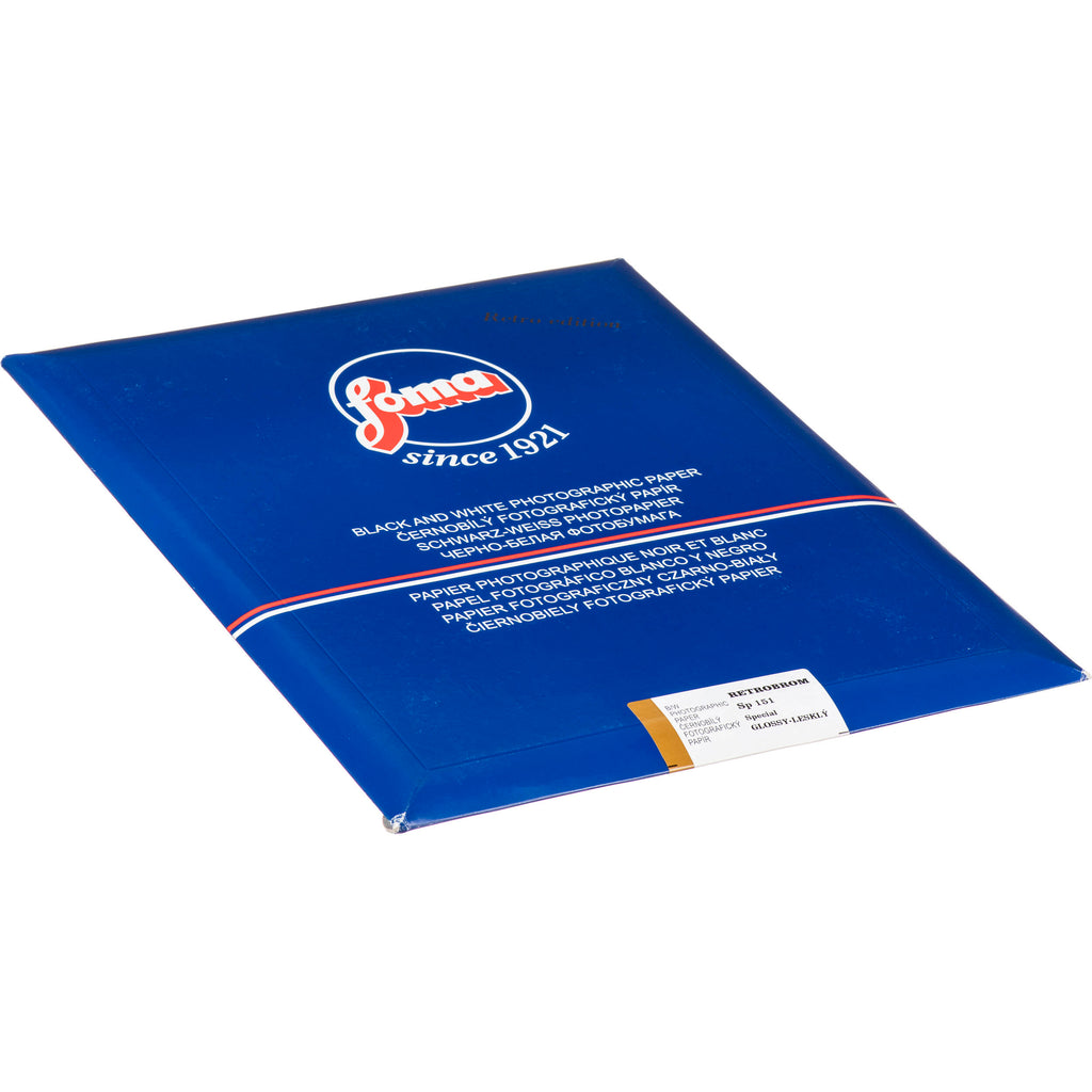 The 11 x 14", 25-count RETROBROM 151 Sp Grade #2 VC FB Glossy Paper from Foma is a customized black-and-white paper featuring silver bromide iodide emulsion. It's made on a thick, double-weight fiber-based (FB) baryta paper base and offers a rich halftone scale. It can be used for exposure or developing. It has a fine-grain and warm green-brown tone, and the paper base is colored in a light green-yellow tint.