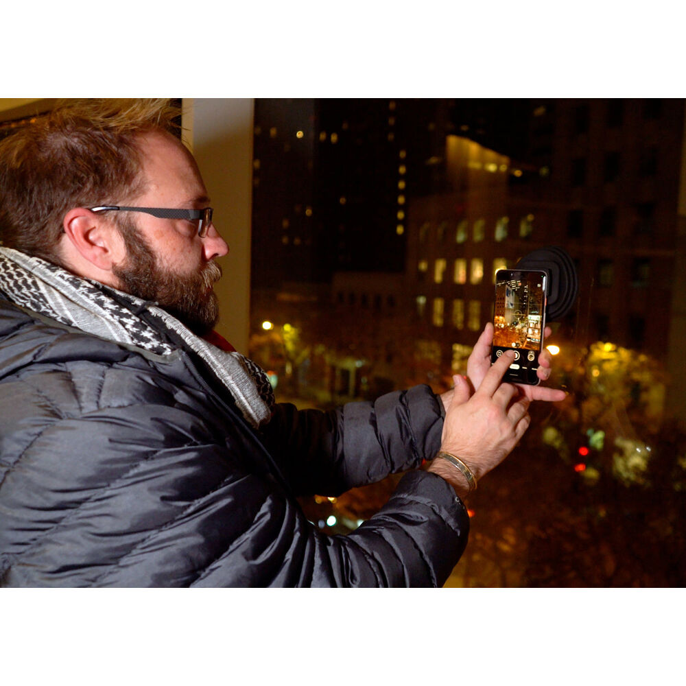 Take clear pictures through windows and other reflective glass partitions with the Ninja Flexible Window Hood for Smartphones from FotodioX. The large, gusseted silicone hood has three suction cups that attach to the glass. Simply slide your phone's corner cameras into the opening to snap photos and record videos that are free from reflections and glare. The flexibility of the silicone gives you the added benefit of being able to angle your phone for the perfect shot. It's a great accessory to have handy in many different situations, such as shooting through the windows of your home, at the zoo, at the museum, and from observation decks.