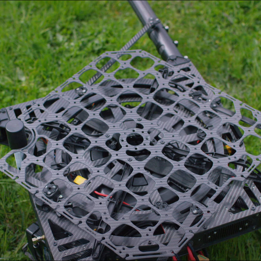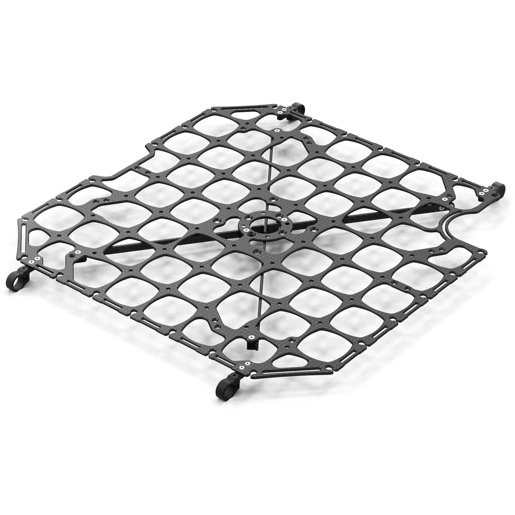 The Tray Kit can be used for delivering groceries, medical supplies, and similar packages. Your load is secured to a 1" thick carbon fiber cargo plate, which offers slots and tie-down points that support standard 3/4" nylon straps and shock cords, sold separately. The carbon fiber plate is also designed with vertical stiffener ribs that add rigidity and ensure good performance even with heavy loads. For further customization, standoff mounts are also included and can be attached to the plate.
