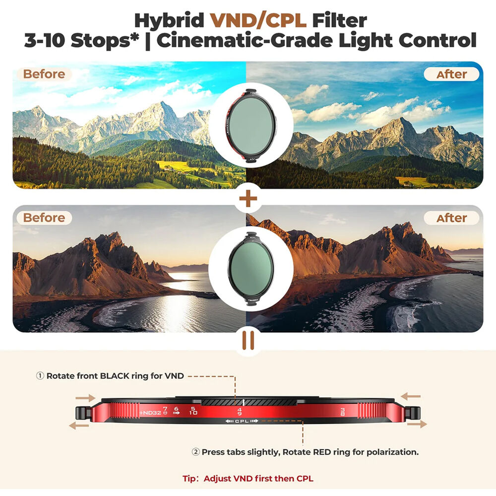 When these two filters are used together, you achieve an increased total light reduction of up to 10+ stops. This combination allows for greater light control and more creative options, especially in extremely bright conditions or for long-exposure photography.