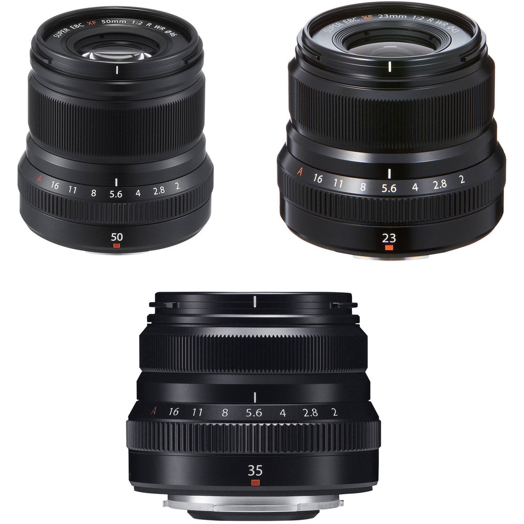 Combining three versatile, compact, and lightweight primes for X-mount mirrorless cameras, the black FUJIFILM XF 50mm, 35mm, and 23mm f/2 WR Lenses Kit from bundles the portrait-length, normal, and wide-angle lenses for a comprehensive kit to suit a wide variety of photographic situations.