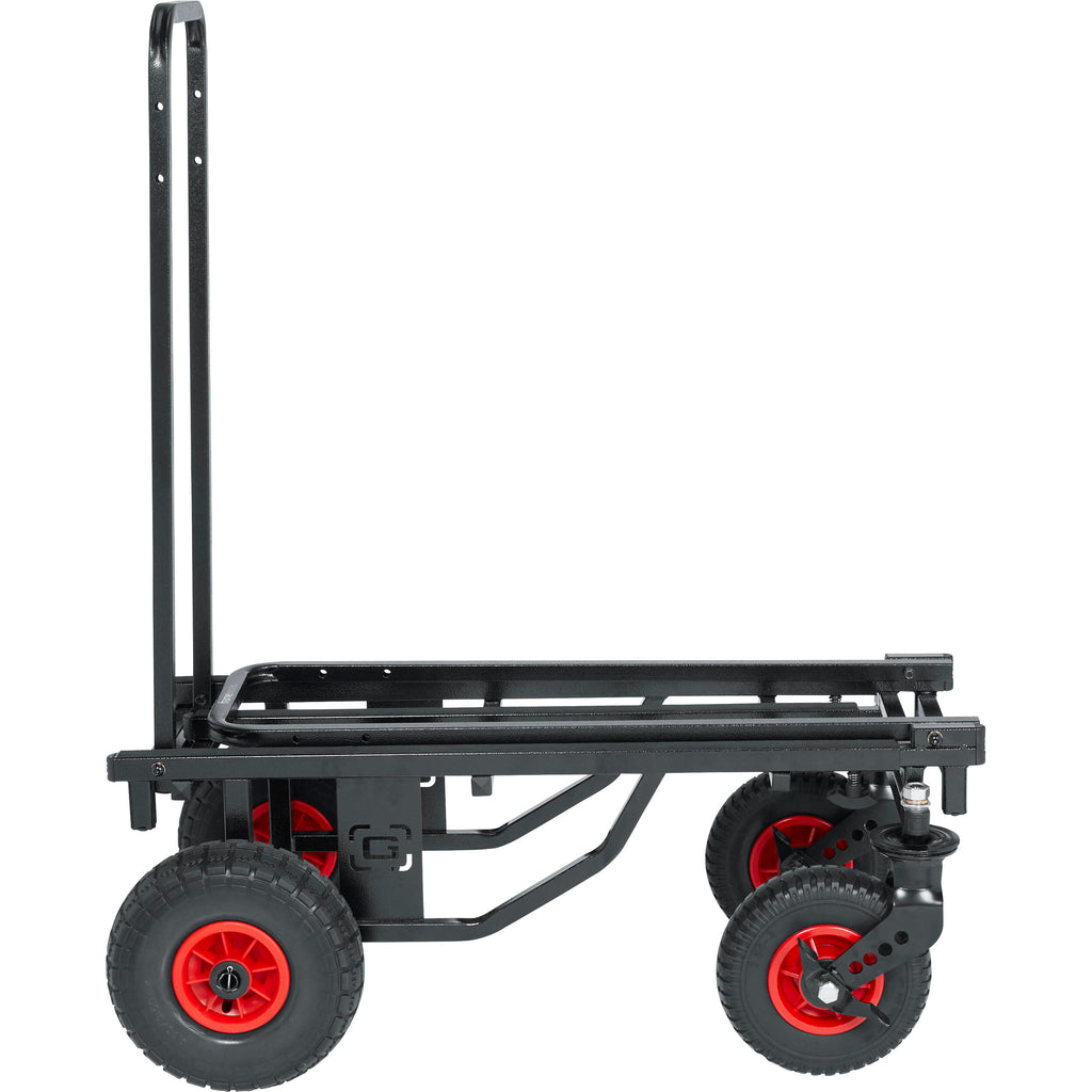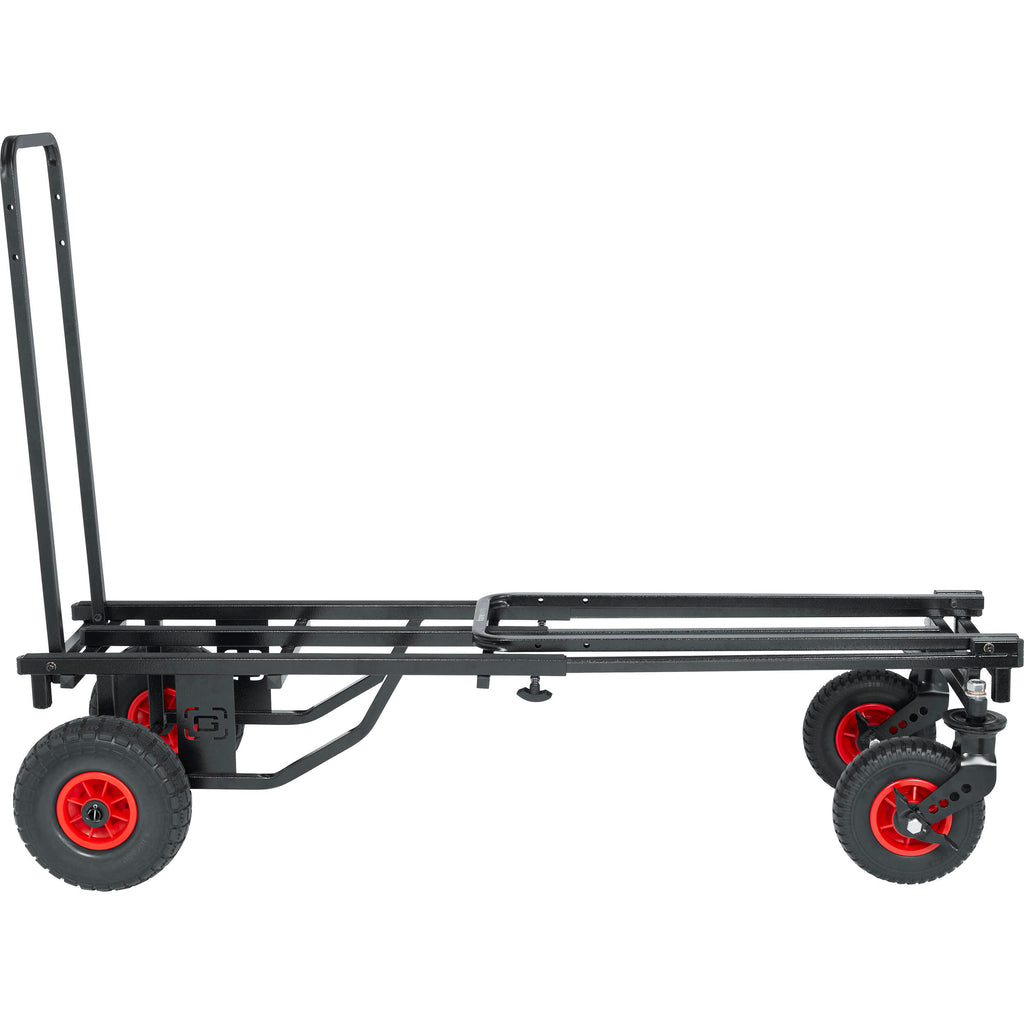 The Gator Cases 52" Utility Cart All-Terrain transforms into eight different configurations to accommodate a wide variety of equipment in the most efficient way possible. The cargo platform length extends from 30 to 52" and is secured with spring-tightening knobs and a spring clip. Non-pneumatic tires allow for hassle-free operation while stair climbers let you more easily carry your load up curbs and steps. The cart has a heavy-duty welded steel frame with a non-skid grip tape surface, and it supports loads up to 500 lb.