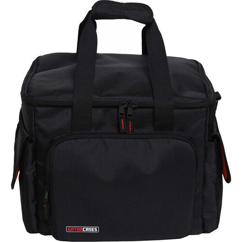 This small-size Cable & Accessory Organization Bag from Gator is designed to keep your cables separated and organized for quick identification. It features five removable padded hook-and-loop dividers and multiple exterior and interior pockets. The bag has a bright orange interior for enhanced visibility in low-light conditions. On the bottom, it has protective non-slip rubber feet.
