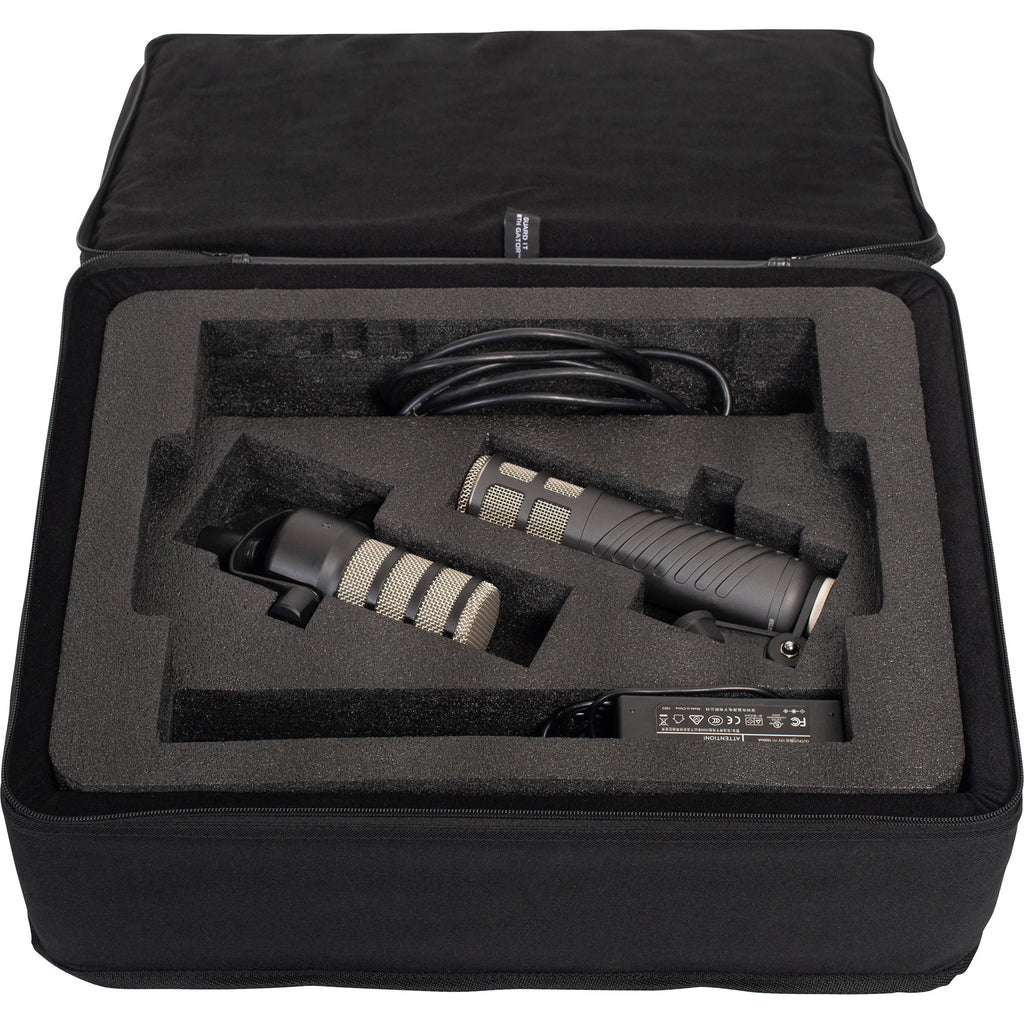 The lightweight GL Microphone Series Lightweight Case for Rodecaster Pro and Two Mics from Gator Cases is a custom foam-cut case that is designed to carry and protect the RODECaster Pro podcast mixer and two podcast microphones, such as the PodMic or Procaster models.