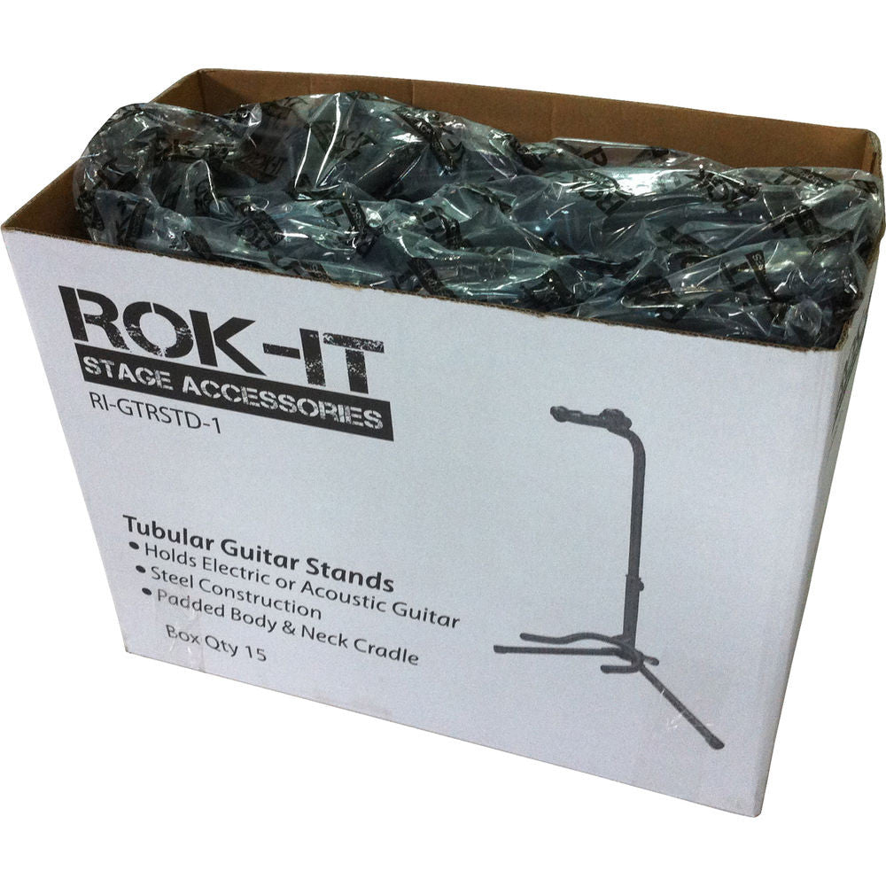 The Gator Cases Rok-It Tripod Guitar Stand is a single tripod stand designed to safely and securely hold your electric or acoustic guitar or bass on the floor in a studio, home, store, or on stage. The heavy-duty metal tube construction provides stability and the black powder-coat finish delivers durability. The neck and body supports feature padding that protects your instrument from scuffs and dings at points of contact with the stand. A neck restraint offers additional security by preventing your guitar or bass from falling forward out of the stand and rubber feet keep the stand from sliding across your floor.