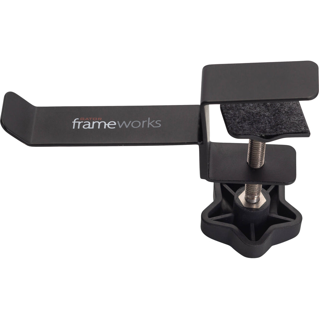 Designed for recording and project studios, broadcast houses, touring companies, or anyone looking to keep their headphones readily available and out of harm's way, the Gator Cases Frameworks Headphone Hanger for Desks reduces the risk of damage due to leaving headphones improperly stored on floors, desks, drawers, or other temporary surfaces. The clamp utilizes a table edge, accommodating a thickness of up to 1.5". The hanger can also work alternatively as a cable hanger.